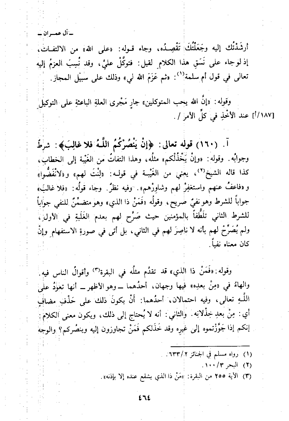 قوله تعالى: {إِن يَنصُرْكُمُ الله فَلاَ غَالِبَ} : شرطٌ وجوابُه. وقوله: {وَإِن يَخْذُلْكُمْ} مثلُه، وهذا التفاتٌ من الغَيْبة إلى الخطاب، كذا قاله الشيخ، يعني من الغَيْبة في قوله: {لِنتَ لَهُمْ} و {لاَنْفَضُّواْ} و {فاعف عَنْهُمْ واستغفر لَهُمْ وَشَاوِرْهُمْ} . وفيه نظرٌ. وجاء قولُه: {فَلاَ غَالِبَ} جواباً للشرط وهو نفيٌ صريح، وقولُه {فَمَن ذَا الذي} وهو متضمِّنٌ للنفي جواباً للشرط الثاني تلَطُّفاً بالمؤمنين حيث صَرَّح لهم بعدم الغَلَبةِ في الأولِ، ولم يُصَرِّحْ لهم بأنه لا ناصِرَ لهم في الثاني، بل أتى في صورةِ الاستفهامِ وإنْ كان معناه نفياً.