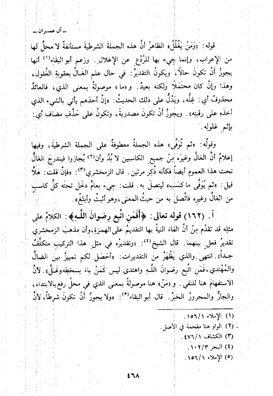 قوله تعالى: {أَفَمَنِ اتبع رِضْوَانَ الله} : الكلامُ على مثلِه قد تقدَّم مِنْ أنَّ الفاءَ النيةُ بها التقديمُ على الهمزةِ، وأن مذهبَ الزمخشري تقديرُ فعلٍ بينهما. قال الشيخ: «وتقديرُه في مثلِ هذا التركيبِ متكلَّفٌ جداً» . انتهى. والذي يَظْهَرُ من التقديرات: «أحَصَل لكم تمييزٌ بين الضالِّ والمُهْتدي، فَمَنِ اتَّبع رضوانَ اللهِ واهتدى ليس كَمَنْ باءَ بسخطِه وغلَّ» . لأنَّ الاستفهامَ هنا للنفي. و «مَنْ» هنا موصولةٌ بمعنى الذي في محلِّ رفع بالابتداء، والجارُّ والمجرورُ الخبرُ. قال أبو البقاء: «ولا يجوزُ أَنْ تكونَ شرطاً، لأنَّ»