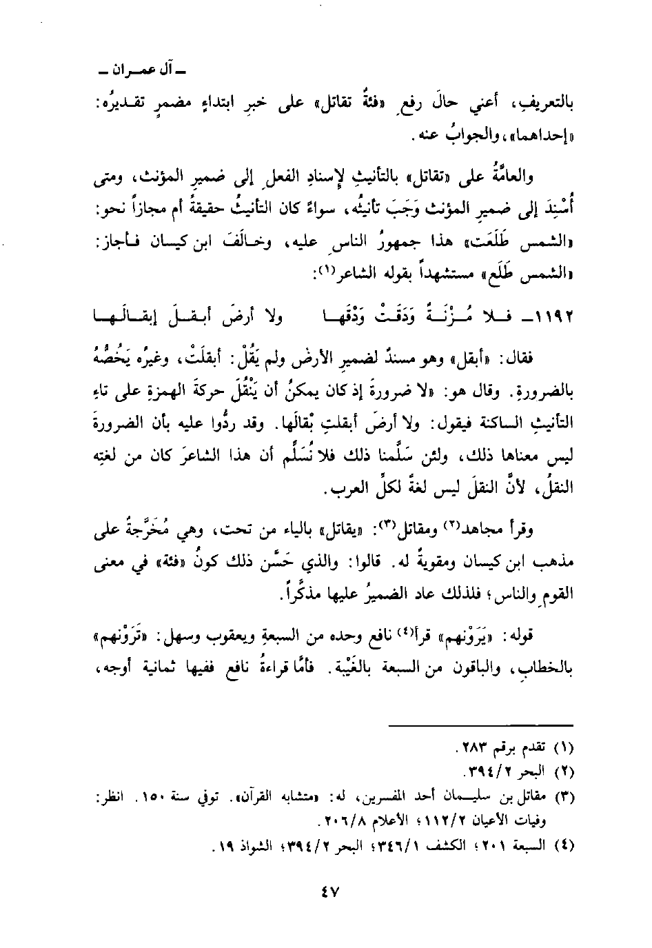والعامَّةُ على «تقاتل» بالتأنيثِ لإِسنادِ الفعلِ إلى ضميرِ المؤنث، ومتى أُسْنِدَ إلى ضميرِ المؤنث وَجَبَ تأنيثُه، سواءً كان التأنيثُ حقيقةً ِأم مجازاً نحو: «الشمس طَلَعَت» هذا جمهورُ الناسِ عليه، وخالَفَ ابن كيسان فأجاز: «الشمس طَلَع» مستشهداً بقوله الشاعر: