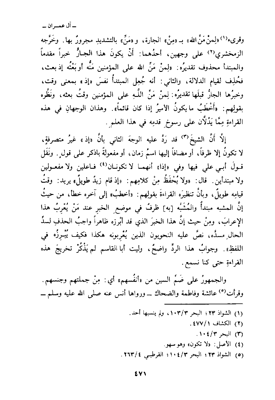 وقرىء «لِمنْ مَنِّ الله» ب «مِنْ» الجارة، و «مَنِّ» بالتشديدِ مجرورٌ بها. وخَرَّجه الزمخشري على وجهين، أحدُهما: أَن يكونَ هذا الجارُّ خبراً مقدماً والمبتدأ محذوف تقديرُه: «لِمنْ مَنِّ الله على المؤمنين مَنُّه أو بَعْثُه إذ بعث، فحُذِف لقيام الدلالة، والثاني: أنه جُعِل المبتدأُ نفسَ» إذ «بمعنى وقت، وخبرُها الجارُّ قبلَها تقديرُه: لِمْن مَنِّ اللهِ على المؤمنين وقتُ بعثه، ونَظَّره بقولِهم:» أَخْطَبُ ما يكونُ الأميرُ إذا كان قائماً «. وهذان الوجهانِ في هذه القراءةِ مِمَّا يَدُلاَّن على رسوخِ قدمِه في هذا العلمِ.