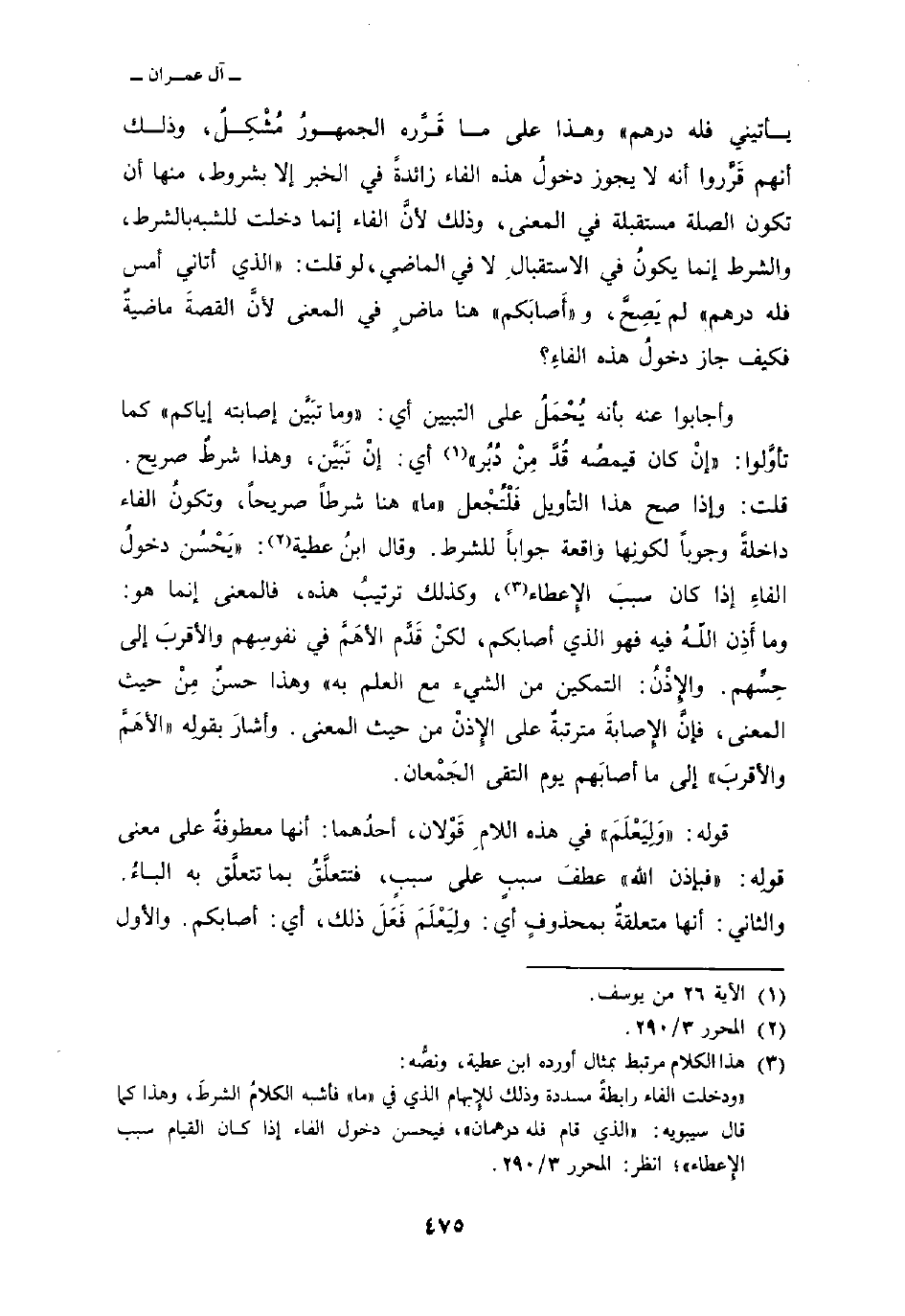 وأجابوا عنه بأنه يُحْمَلُ على التبيين أي: «وما تبَيَّن إصابته إياكم» كما تأوَّلوا: {وَإِنْ كَانَ قَمِيصُهُ قُدَّ مِن دُبُرٍ} [يوسف: 27] أي: إنْ تَبَيَّن، وهذا شرطٌ صريح. قلت: وإذا صح هذا التأويل فَلتُجْعل «ما» هنا شرطاً صريحاً، وتكونُ الفاء داخلةً وجوباً لكونِها واقعة جواباً للشرط. وقال ابنُ عطية: «يَحْسُن دخولُ الفاءِ إذ1اكان سببَ الإِعطاءِ، وكذلك ترتيبُ هذه، فالمعنى إنما هو: وما أَذِن اللهُ فيه فهو الذي أصابكم، لكنْ قَدَّم الأهَمَّ في نفوسِهم والأقربَ إلى حِسِّهم. والإِذْنُ: التمكين من الشيء مع العلم به» وهذا حسنٌ مِِنْ حيث المعنى، فإنَّ الإِصابةَ مترتبةٌ على الإِذْن من حيث المعنى. وأشارَ بقولِه «الأهَمَّ والأَقربَ» إلى ما أصابَهم يوم التقى الجَمْعان.