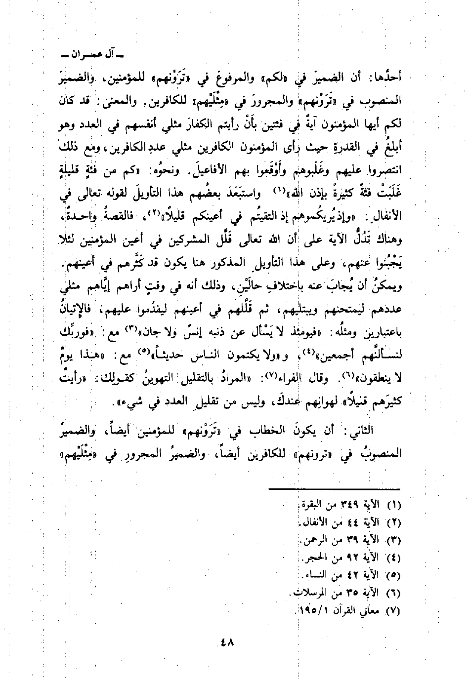 أحدُها: أن الضميرَ في» لكم «والمرفوعَ في» تَرَوْنهم «للمؤمنين، والضميرَ المنصوب في» تَرَوْنهم «والمجرورَ في» مِثْلَيْهم «للكافرين. والمعنى: قد كان لكم أيها المؤمنون آيةٌ في فئتين بأَنْ رأيتم الكفارَ مثلي أنفسهم في العدد وهو أبلغُ في القدرةِ حيث رأى المؤمنون الكافرين مثلي عددِ الكافرين، ومع ذلك انتصروا عليهم وغَلَبوهم وأَوْقَعوا بهم الأفاعيلَ. ونحُوه: {كَم مِّن فِئَةٍ قَلِيلَةٍ غَلَبَتْ فِئَةٍ كَثِيرَةً بِإِذْنِ الله} [البقرة: 249] واستبَعَدَ بعضُهم هذا التأويلَ لقوله تعالى في الأنفالِ: {وَإِذْ يُرِيكُمُوهُمْ إِذِ التقيتم في أَعْيُنِكُمْ قَلِيلاً} [الآية: 44] ، فالقصةُ واحدةٌ، وهناك تَدُلُّ الآية على أن الله تعالى قَلَّل المشركين في أعين المؤمنين لئلا يَجْبُنوا عنه، وعلى هذا التأويلِ المذكور هنا يكون قد كَثَّرهم في أعينهم. ويمكنُ أن يُجابَ عنه باختلافِ حالَيْنِ، وذلك أنه في وقتٍ أراهم إيَّاهم مثلي عددهم ليمتحنهم ويبتليهم، ثم قَلَّلهم في أعينهم ليقدُموا عليهم، فالإِتيانُ باعتبارين ومثلُه: {فَيَوْمَئِذٍ لاَّ يُسْأَلُ عَن ذَنبِهِ إِنسٌ وَلاَ جَآنٌّ} [الرحمن: 39] مع: {فَوَرَبِّكَ لَنَسْأَلَنَّهُمْ أَجْمَعِينَ} [الحجر: 92] ، {وَلاَ يَكْتُمُونَ الله حَدِيثاً} [النساء: 42] مع: {هذا يَوْمُ لاَ يَنطِقُونَ} [المرسلات: 35] . وقال الفراء:» المرادُ بالتقليل التهوينُ كقولِك: «رأيتُ كثيرَهم قليلاً» لهوانِهِم عندكَ، وليس من تقليلِ العدد في شيء «.