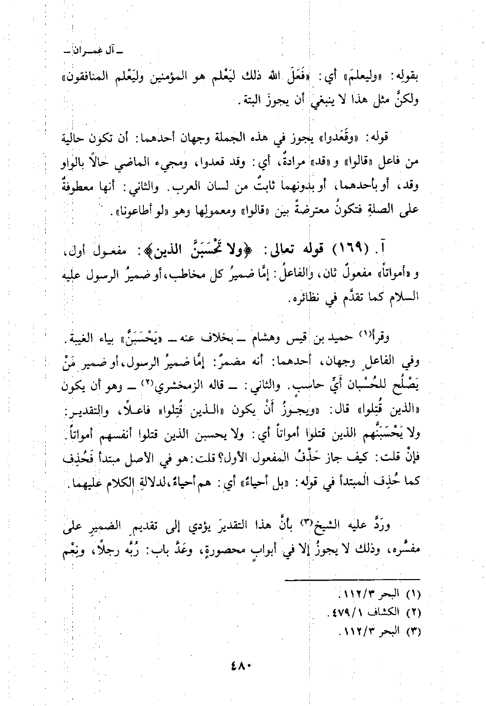 وقرأ حميد بن قيس وهشام بخلاف عنه «يَحْسَبَنَّ» بياء الغيبة. وفي الفاعلِ وجهان، أحدهما: أنه مضمرٌ: إمَّا ضميرُ الرسول، أو ضمير مَنْ يَصْلُح للحُسْبان أَيِّ حاسبٍ. والثاني: قاله الزمخشري وهو أن يكون «الذين قُتِلوا» قالِ: «ويجوزُ أَنْ يكون» الذين قُتِلوا «فاعلاً، والتقدير: ولا يَحْسَبَنَّهم الذين قتلوا أمواتاً أي: ولا يحسبن الذين قتلوا أنفسهم أمواتاً. فإنْ قلت: كيف جاز حَذْفُ المفعول الأول؟ قلت: هو في الأصل مبتدأ فَحُذِف كما حُذِف المبتدأ في قوله:» بل أحياءٌ «أي: هم أحياءٌ، لدلالة الكلام عليهما.