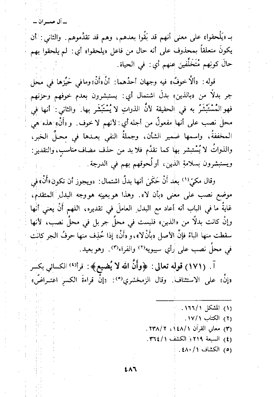 قوله: {أَلاَّ خَوْفٌ} فيه وجهان أحدُهما: أنَّ «أَنْ» وما في حَيِّزها في محل جر بدلاً من «بالذين» بدلَ اشتمال أي: يستبشرون بعدم خوفهم وحزنهم فهم المُسْتَبْشَرُ به في الحقيقة لأنَّ الذواتِ لا يُسْتَبْشَر بها. والثاني: أنها في محل نصب على أنها مفعولٌ من أجله أي: لأنهم لا خوف. و «أَنْ» هذه هي المخففةُ، واسمها ضمير الشأن، وجملةُ النفي بعدها في محلِّ الخبر، والذواتُ لا يُسْتبشر بها كما تقدَّم فلا بد من حذف مضاف مناسبٍ، والتقدير: ويستبشرون بسلامةِ الذين، أو لُحوقهم بهم في الدرجة.