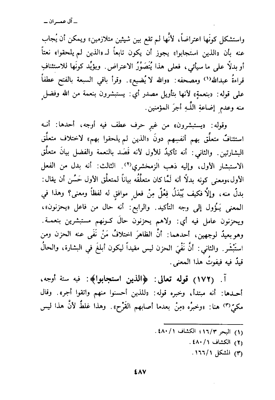 واسشكل كونَها اعتراضاً، لأنَّها لم تقع بين شيئين متلازمين «ويمكن أن يُجاب عنه بأن» الذين استجابوا «يجوز أن يكون تابعاً ل» الذين لم يلحقوا «نعتاً أو بدلاً على ما سيأتي، فعلى هذا يُتَصَوَّرُ الاعتراض. ويؤيِّد كونَها للاستئنافِ قراءةُ عبد الله ومصحفه:» والله لا يُضيع «. وقرأ باقي السبعة بالفتح عطفاً على قوله:» بنعمةٍ «لأنها بتأويل مصدر أي: يستبشرون بنعمة من الله وفضلٍ منه وعدمِ إضاعةِ اللهِ أجرَ المؤمنين.