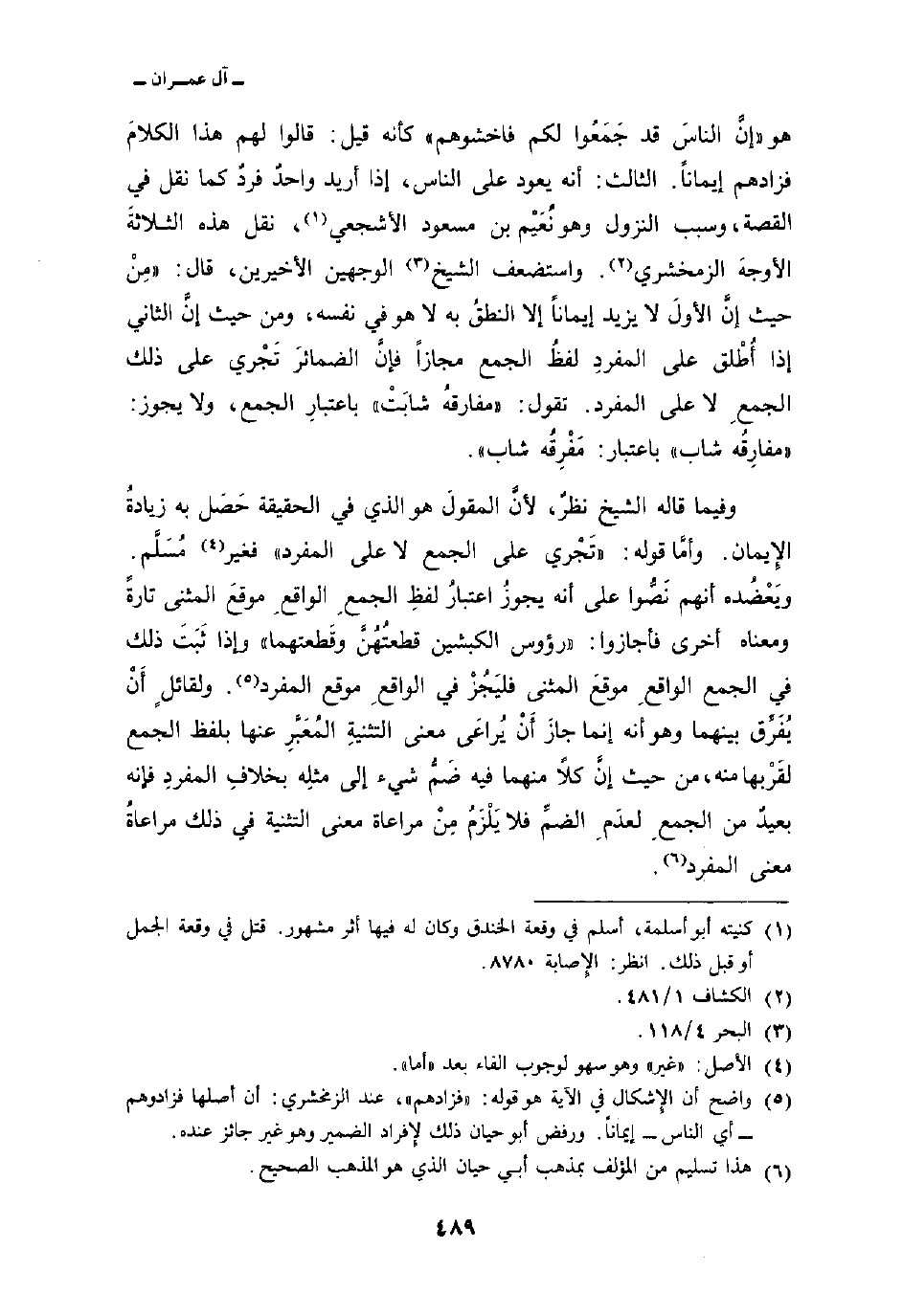 هو {إِنَّ الناس قَدْ جَمَعُواْ لَكُمْ فاخشوهم} كأنه قيل: قالوا لهم هذا الكلامَ فزادهم إيماناً. الثالث: أنه يعود على الناس، إذ أريد واحدٌ فردٌ كما نقل في القصة، وسبب النزول وهو نُعَيْم بن مسعود الأشجعي، نقل هذه الثلاثةَ الأوجهَ الزمخشري. واستضعف الشيخ الوجهين الأخيرين، قال: «مِنْ حيث إنَّ الأولَ لا يزيد إيماناً إلا النطقُ به لا هو في نفسه، ومن حيث إنَّ الثاني إذا أُطلْق على المفردِ لفظُ الجمع مجازاً فإنَّ الضمائرَ تَجْري على ذلك الجمعِ لا على المفرد. تقول:» مفارقُه شابَتْ «باعتبارِ الجمع، ولا يجوز:» مفارِقُه شاب «باعتبار: مَفْرِقُه شاب» .