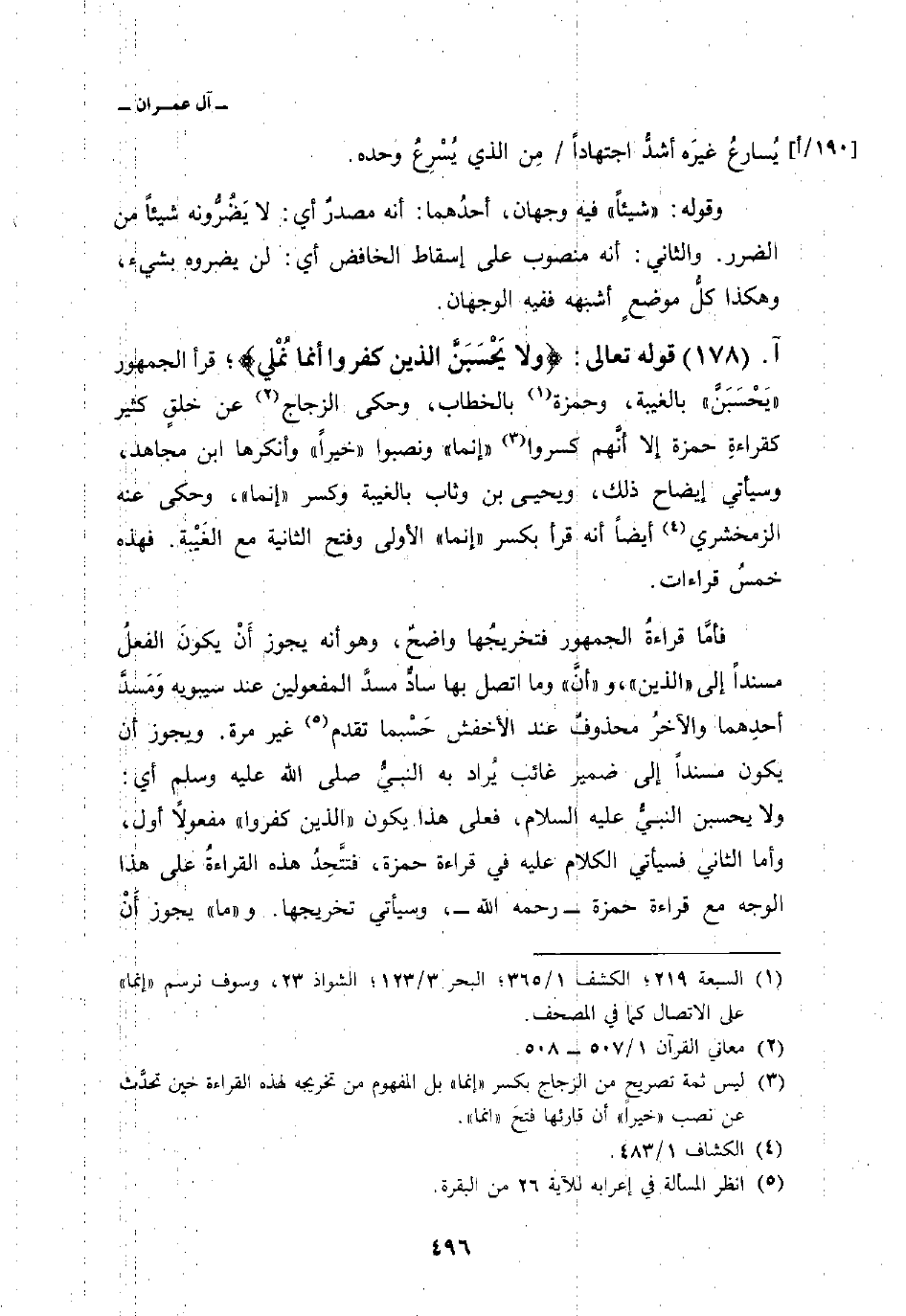 قوله تعالى: {وَلاَ يَحْسَبَنَّ الذين كَفَرُواْ أَنَّمَا نُمْلِي} ؛ قرأ الجمهور «يَحْسَبَنَّ» بالغيبة، وحمزة بالخطاب، وحكى الزجاج عن خلقٍ كثير كقراءةِ حمزة إلا أنَّهم كسروا «إنما» ونصبوا «خيراً» وأنكرها ابن مجاهد، وسيأتي إيضاح ذلك، ويحيى بن وثاب بالغيبة وكسر «إنما» ، وحكى عنه الزمخشري أيضاً أنه قرأ بكسر «إنما» الأولى وفتح الثانية مع الغَيْبة. فهذه خمسُ قراءات.