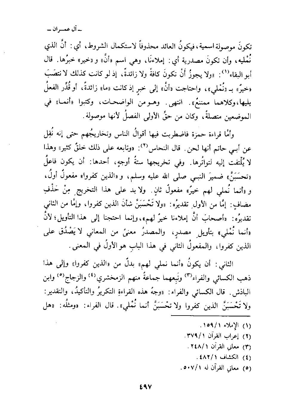 وأمَّا قراءة حمزة فاضطربت فيها أقوالُ الناس وتخاريجُهم حتى إنه نُقِل عن أبي حاتم أنها لحن. قال النحاس: «وتابعه على ذلك خلقٌ كثير» وهذا لا يُلْتفت إليه لتواتُرها. وفي تخريجها ستةٌ أوجهٍ، أحدها: أن يكون فاعلُ «تحسَبَنَّ» ضميرَ النبي صَلَّى اللهُ عَلَيْهِ وَسَلَّمَ، و {الذين كَفَرُواْ} مفعولٌ أولُ، و {أَنَّمَا نُمْلِي لَهُمْ خَيْرٌ} مفعولٌ ثانٍ. ولا بد على هذا التخريجِ مِنْ حَذْفِ مضافٍ: أمَّا من الأولِ تقديرُه: «ولا تَحْسَبَنَّ شأنَ الذين كفروا» ، وإمَّا من الثاني تقديرُه: «أصحابَ أنَّ إملاءنا خيرٌ لهم» ، وإنما احتجنا إلى هذا التأويل؛ لأنَّ «أنما نُمْلي» بتأويلِ مصدرٍ، والمصدرُ معنىً من المعاني لا يَصْدُق على الذين كفروا، والمفعولُ الثاني في هذا البابِ هو الأولُ في المعنى.