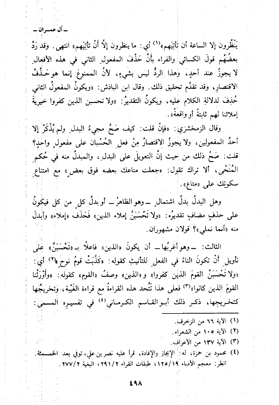 يَنظُرُونَ إِلاَّ الساعة أَن تَأْتِيَهُمْ} [الزخرف: 66] أي: ما ينظرون إلاَّ أَنْ تأتِيَهم» انتهى. وقد رَدَّ بعضُهُم قول الكسائي والفراء بأَنْ حَذْفَ المفعولِ الثاني في هذه الأفعالِ لا يجوزُ عند أحدٍ، وهذا الردُّ ليس بشيءٍ، لأنَّ الممنوعَ إنما هو حَذْفُ الاقتصارِ، وقد تقدَّم تحقيق ذلك. وقال ابن الباذش: «ويكونُ المفعولُ الثاني حُذِفَ لدلالةِ الكلام عليه، ويكونُ التقديرُ:» ولا تحسبنُ الذين كفروا خيريةَ إملائنا لهم ثابتةً أو واقعةً «.