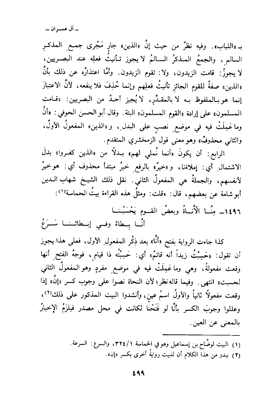 كذا جاءت الرواية بفتح «أنَّا» بعد ذِكْر المفعولِ الأول، فعلى هذا يجوز أن تقول: «حَسِبْتُ زيداً أنه قائمٌ» أي: حَسِبْتُه ذا قيامٍ، فوجهُ الفتحِ أنها وقعت مفعولةً، وهي وما عَمِلَتْ فيه في موضعِ مفردٍ وهو المفعولُ الثاني لحسبت «انتهى. وفيما قاله نظر؛ لأن النحاة نصوا على وجوب كسر» إنَّ «إذا وقعت مفعولاً ثانياً والأولُ اسمُ عينٍ، وأنشدوا البيت المذكور على ذلك، وعللوا وجوبَ الكسر بأنَّا لو فَتَحْنا لكانت في محل مصدر فليزَمُ الإِخبارُ المعنى عن العين.