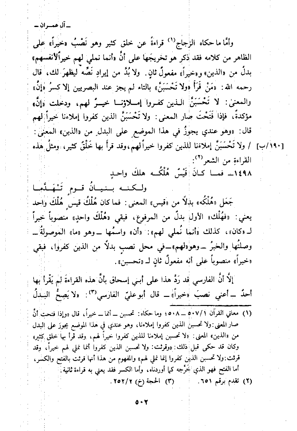 جَعَل «هُلْكُه» بدلاً من «قيس» المعنى: فما كان هُلْكُ قيسٍ هُلْكَ واحد يعني: «فهُلْك» الأول بدلٌ من المرفوع، فبقي «هُلْكَ واحدٍ» منصوباً خبراً ل «كان» ، كذلك {أَنَّمَا نُمْلِي لَهُمْ} : «أن» واسمُها وهو «ما» الموصولةُ وصلتُها والخبرُ وهو «لهم» في محل نصبٍ بدلاً من الذين كفروا، فبقي «خيراً» منصوباً على أنه مفعولٌ ثانٍ ل «تحسبن» .