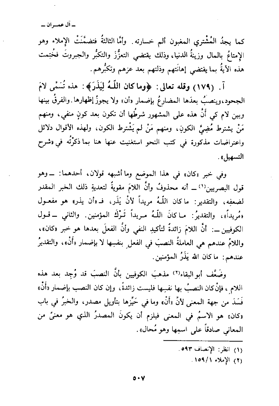 وفي خبر «كان» في هذا الموضع وما أشبهه قولان، أحدهما: وهو قول البصريين أنه محذوفٌ وأنَّ اللامَ مقويةٌ لتعديةِ ذلك الخبر المقدر لضعفِه، والتقدير: ما كان اللهُ مريداً لأنْ يَذَر، ف «أن يذر» هو مفعول «مُريداً» ، والتقديرُ: ما كانَ اللهُ مريداً تَرْكَ المؤمنين. والثاني قول الكوفيين: أنَّ اللامَ زائدةٌ لتأكيدِ النفي وأنَّ الفعلَ بعدها هو خبر «كان» ، واللامُ عندهم هي العاملةُ النصبَ في الفعلِ بنفسِها لا بإضمار «أَنْ» ، والتقديرُ عندهم: ما كان الله يَذَرُ المؤمنين.
