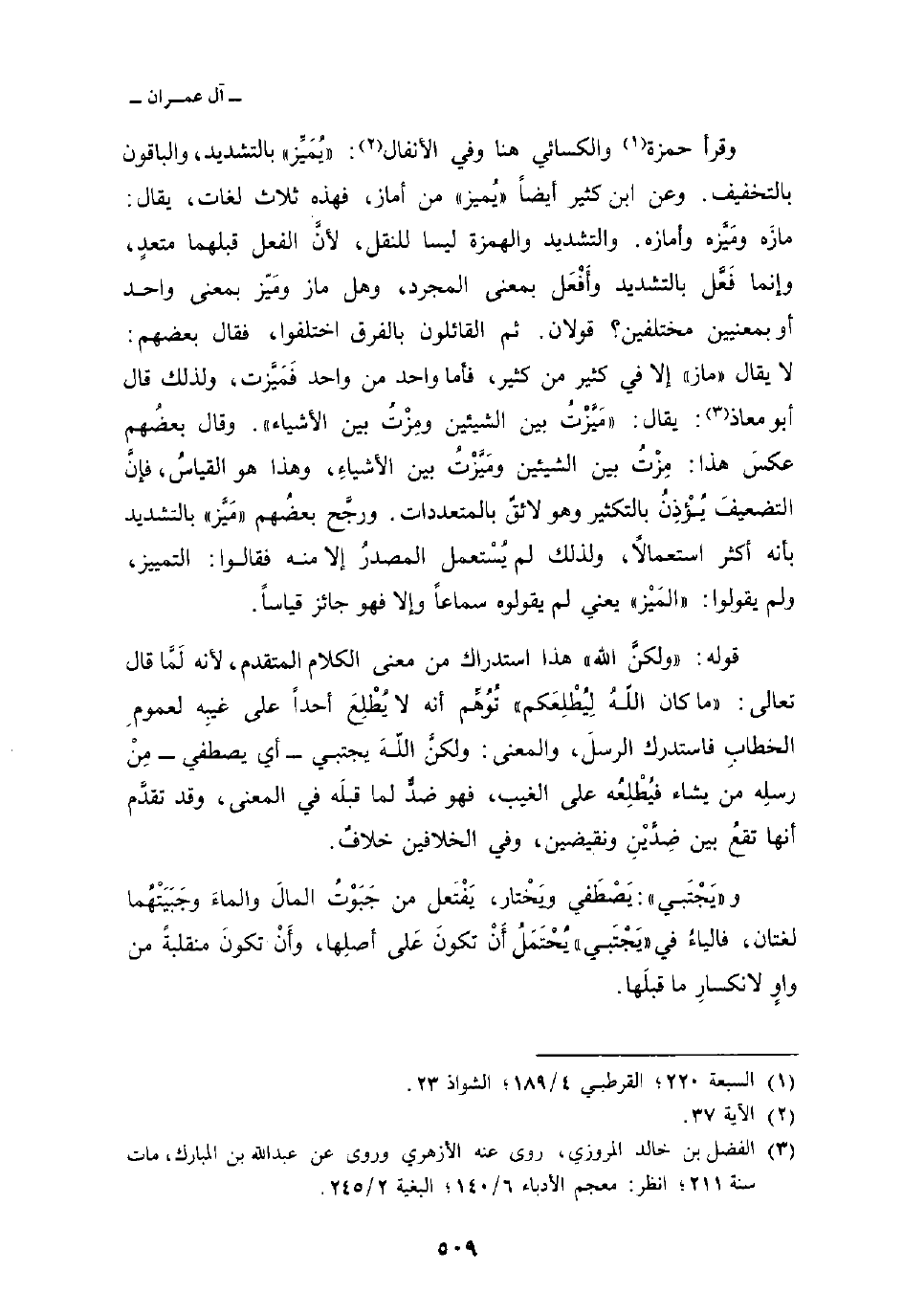 وقرأ حمزة والكسائي هنا وفي الأنفال: «يُمَيِّز» بالتشديد، والباقون بالتخفيف. وعن ابن كثير أيضاً «يُميز» من أماز، فهذه ثلاث لغات، يقال مازَه ومَيَّزه وأمازه. والتشديد والهمزة ليسا للنقل، لأنَّ الفعل قبلهما متعدٍ، وإنما فَعَّل بالتشديد وأَفْعَل بمعنى المجرد، وهل ماز ومَيّز بمعنى واحد أو بمعنيين مختلفين؟ قولان. ثم القائلون بالفرق اختلفوا، فقال بعضهم: لا يقال «ماز» إلا في كثير من كثير، فأما واحد من واحد فَمَيَّزت، ولذلك قال أبو معاذ: يقال: «مَيَّزْتُ بين الشيئين ومِزْتُ بين الأشياء» . وقال بعضُهم عكسَ هذا: مِزْتُ بين الشيئين ومَيَّزْتُ بين الأشياءِ، وهذا هو القياسُ، فإنَّ التضعيفَ يُؤْذِنُ بالتكثير وهو لائقٌ بالمتعددات. ورجَّح بعضُهم «مَيَّز» بالتشديد بأنه أكثر استعمالاً، ولذلك لم يُسْتعمل المصدرُ إلا منه فقالوا: التمييز، ولم يقولوا: «المَيْز» يعني لم يقولوه سماعاً وإلا فهو جائز قياساً.