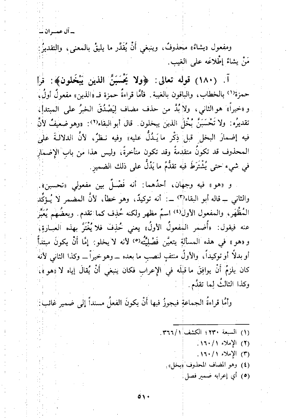 قوله تعالى: {وَلاَ يَحْسَبَنَّ الذين يَبْخَلُونَ} : قرأ حمزة بالخطاب، والباقون بالغيبة. فأمَّا قراءةُ حمزة ف «الذين» مفعولٌ أولُ، و «خيراً» هو الثاني، ولا بُدَّ من حذف مضاف لِيَصْدُقَ الخبرُ على المبتدأِ، تقديرُه: ولا تَحْسَبَنَّ بُخْلَ الذين يبخلون. قال أبو البقاء: «وهو ضعيفٌ لأنَّ فيه إضمارَ البخلِ قبل ذِكْر ما يَدُلُّ عليه» وفيه نظرٌ، لأنَّ الدلالةَ على المحذوف قد تكونُ متقدمةً وقد تكون متأخرةً، وليس هذا من بابِ الإِضمارِ في شيء حتى يُشْتَرَطَ فيه تقدُّمُ ما يَدُلُّ على ذلك الضميرِ.