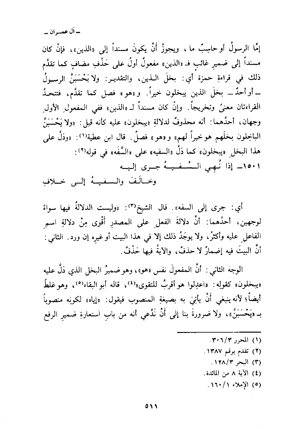 إمَّا الرسولُ أو حاسِبٌ ما، ويجوزُ أَنْ يكونَ مسنداً إلى «الذين» ، فإنْ كان مسنداً إلى ضميرِ غائبٍ ف «الذين» مفعولٌ أولُ على حَذْفِ مضافٍ كما تقدَّم ذلك في قراءةِ حمزة أي: بخلَ الذين، والتقدير: ولا يَحْسَبَنَّ الرسولُ أو أحدُ بخلَ الذين يبخلون خيراً. و «هو» فصل كما تقدَّم، فتتحدُ القراءاتان معنىً وتخريجاً. وإنْ كان مسنداً ل «الذين» ففي المفعولِ الأولِ وجهان، أحدُهما: أنه محذوفٌ لدلالةِ «يبخلون» عليه كأنه قيل: «ولا يَحْسَبَنَّ الباخِلون بخلَهم هو خيراً لهم» و «هو» فصلٌ. قال ابن عطية: «ودَلَّ على هذا البخلِ» يبخلون «كما دَلَّ» السفيه «على» السَّفَه «في قوله: