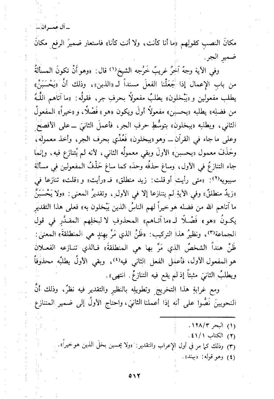 وفي الآية وجهٌ آخرُ غريبٌ خَرَّجه الشيخ قال: «وهو أَنْ تكونَ المسألةُ من بابِ الإِعمال إذا جَعَلْنا الفعلَ مسنداً ل» الذين «، وذلك أنَّ» يَحْسَبَنَّ «يطلب مفعولين و» يَبْخلون «يطلبُ مفعولاً بحرفِ جر، فقولُه: {مَآ آتَاهُمُ الله مِن فَضْلِهِ} يطلبه» يحسبن «مفعولاً أولَ ويكون» هو «فَصْلاً، و» خيراً «المفعولُ الثاني، ويطلبه» يبخلون «بتوسُّطِ حرفِ الجر، فأعملَ الثانيَ على الأفصحِ وعلى ما جاء في القرآن وهو» يبخلون «فَعُدِّي بحرف الجر، وأخذ معموله، وحَذَفَ معمول» يحسبن «الأولَ وبقي معمولُه الثاني، لأنه لم يُتنازع فيه، وإنما جاء التنازعُ في الأول، وساغ حذفُه وحدَه كما ساغ حَذْفُ المفعولين في مسألة سيبويه:» متى رأيت أو قلت: زيد منطلق «ف» رأيت «و» قلت «تنازعا في» زيدُ منطلقٌ «وفي الآيةِ لم يتنازعا إلا في الأولِ، وتقديرُ المعنى:» ولا يَحْسَبَنَّ ما آتاهم الله من فضله هو خيراً لهم الناسُ الذي يَبْخلون به «فعلى هذا التقديرِ يكونُ» هو «فَصْلاً ل» ما آتاهم «المحذوفِ لا لبخلِهم المقدَّرِ في قول الجماعة، ونظيرُ هذا التركيب:» ظنَّ الذي مَرَّ بِهندٍ هي المنطلقةَ «المعنى: ظَنَّ هنداً الشخصُ الذي مَرَّ بها هي المنطلقةَ» فالذي تنازعه الفعلان هو المفعول الأول، فاعمل الفعل الثاني فيه، وبقي الأولُ يطلبُه محذوفاً ويطلبُ الثانيَ مثبتاً إذ لم يقع فيه التنازعُ. انتهى «.