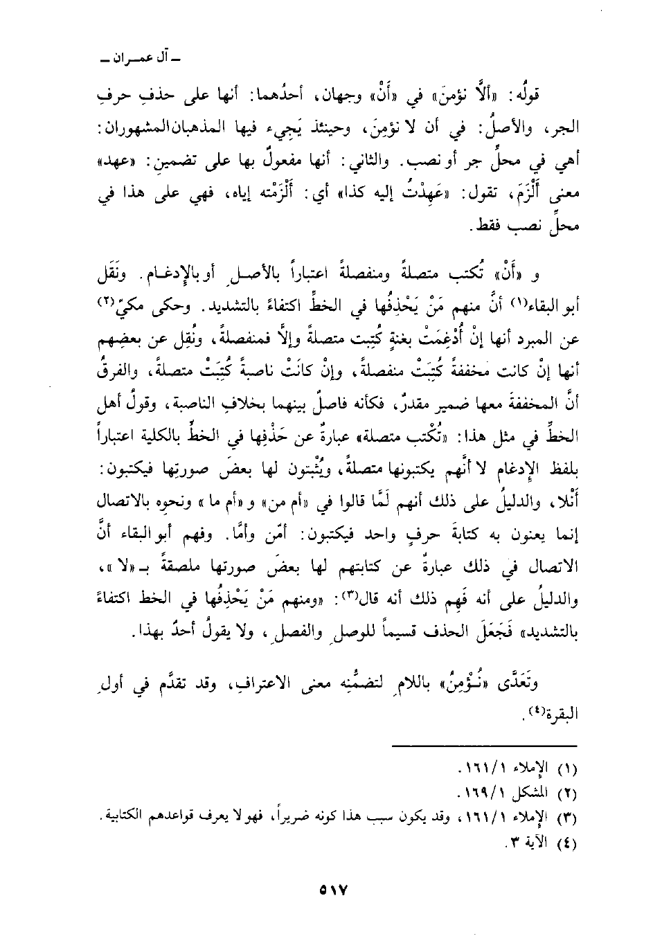 و «أَنْ» تُكتب متصلةً ومنفصلةً اعتباراً بالأصلِ أو بالإِدغام. ونَقَل أبو البقاء أنَّ منهم مَنْ يَحْذِفُها في الخطِّ اكتفاءً بالتشديد. وحكى مكيّ عن المبرد أنها إنْ أُدْغِمَتْ بغنةٍ كُتِبت متصلةً وإلاَّ فمنفصلةً، ونُقِل عن بعضِهم أنها إنْ كانت مخففةً كُتِبَتْ منفصلةً، وإنْ كانَتْ ناصبةً كُتِبَتْ متصلةً، والفرقُ أنَّ المخففةَ معها ضمير مقدرٌ، فكأنه فاصلٌ بينهما بخلافِ الناصبة، وقولُ أهل الخطِّ في مثل هذا: «تُكْتب متصلة» عبارةٌ عن حَذْفِها في الخطِّ بالكلية اعتباراً بلفظ الإِدغام لا أنَّهم يكتبونها متصلةً، ويُثْبتون لها بعضَ صورتِها فيكتبون: أَنْلا، والدليلُ على ذلك أنهم لَمَّا قالوا في «أم من» و «أم ما» ونحوِه بالاتصال إنما يعنون به كتابةَ حرفٍ واحد فيكتبون: أمّن وأمَّا. وفهم أبو البقاء أنَّ الاتصال في ذلك عبارةٌ عن كتابتهم لها بعضَ صورتها ملصقةً ب «لا» ، والدليلُ على أنه فَهِم ذلك أنه قال: «ومنهم مَنْ يَحْذِفُها في الخط اكتفاءً بالتشديد» فَجَعَلَ الحذف قسيماً للوصلِ والفصلِ، ولا يقولُ أحدٌ بهذا.