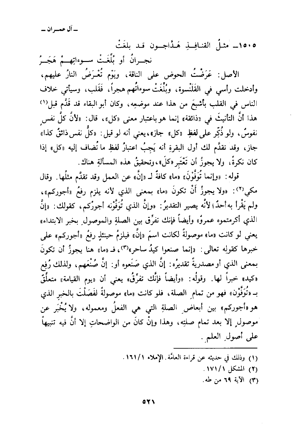 {إِنَّمَا صَنَعُواْ كَيْدُ سَاحِرٍ} [طه: 69] ، ف «ما» هنا يجوزُ أن تكونَ بمعنى الذي أو مصدريةً تقديرُه: إنَّ الذي صَنَعوه أو: إنَّ صُنْعَهم، ولذلك رُفِع «كيد» خبراً لها. وقولُه: «وأيضاً فإنَّك تفرِّقُ» يعني أن «يوم القيامة» متعلِّقٌ ب «تُوَفَّوْن» فهو من تمامِ الصلة، فلو كانت «ما» موصولةً لفَصَلْتَ بالخبرِ الذي هو «أجوركم» بين أبعاضِ الصلةِ التي هي الفعلُ ومعموله، ولا يُخْبَر عن موصولٍ إلا بعد تمام صلتِه، وهذا وإنْ كانَ من الواضحاتِ إلا أنَّ فيه تنبيهاً على أصولِ العلمِ.
