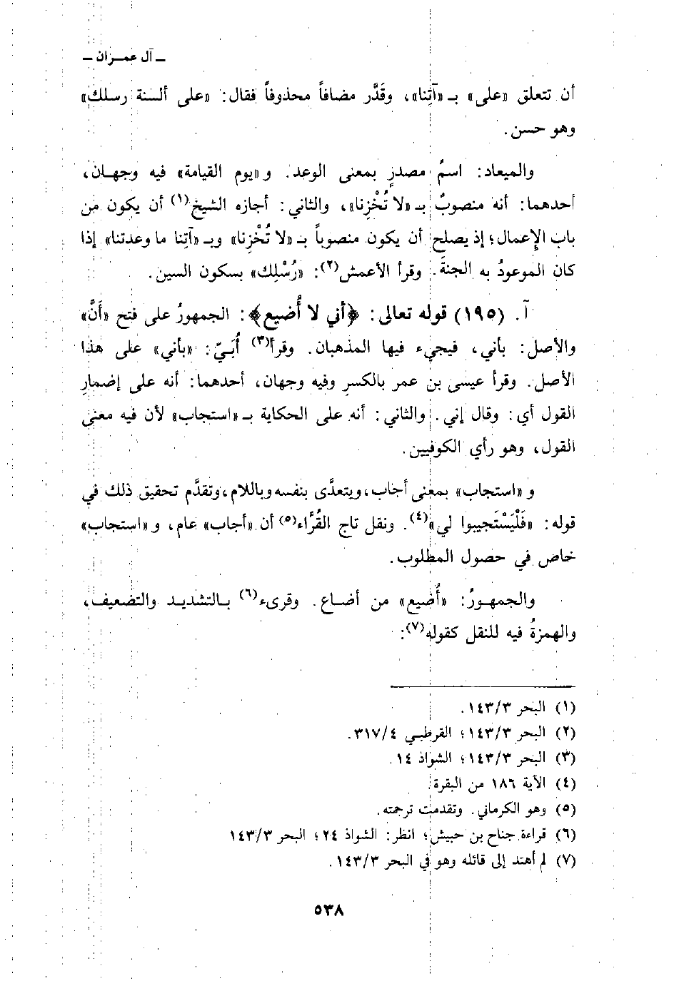 قوله تعالى: {أَنِّي لاَ أُضِيعُ} : الجمهورُ على فتح «أَنَّ» والأصل: بأني، فيجيء فيها المذهبان. وقرأ أُبَيّ: «بأني» على هذا الأصل. وقرأ عيسى بن عمر بالكسرِ وفيه وجهان، أحدهما: أنه على إضمارِ القول أي: وقال إني. والثاني: أنه على الحكاية ب «استجاب» لأن فيه معنى القول، وهو رأي الكوفيين.