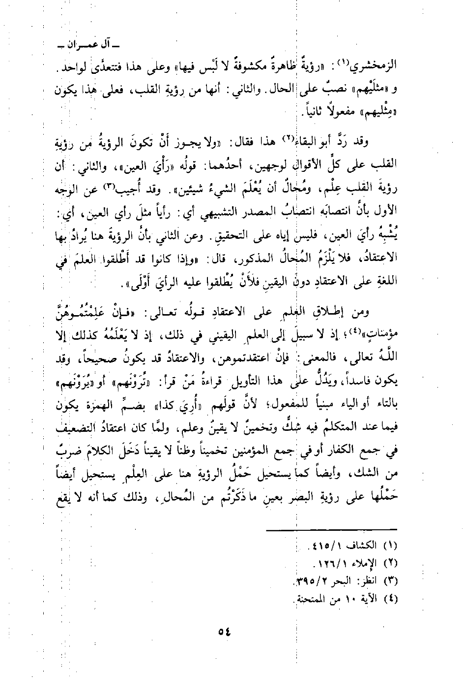 ومن إطلاقِ العلمِ على الاعتقادِ قولُه تعالى: {فَإِنْ عَلِمْتُمُوهُنَّ مُؤْمِنَاتٍ} [الممتحنة: 10] ؛ إذ لا سبيلَ إلى العلمِ اليقيني في ذلك، إذ لا يَعْلَمُهُ كذلك إلا اللهُ تعالى، فالمعنى: فإنْ اعتقدتموهن، والاعتقادُ قد يكونُ صحيحاً، وقد يكون فاسداً، ويَدُلُّ على هذا التأويلِ قراءةُ مَنْ قرأ: «تُرَوْنَهم» أو «يُرَوْنَهم» بالتاء أو الياء مبنياً للمفعول؛ لأنَّ قولَهم «أُرِيَ كذا» بضمِّ الهمزة يكون فيما عند المتكلمُ فيه شكٌّ وتخمينٌ لا يقينٌ وعلم، ولمَّا كان اعتقادُ التضعيف في جمع الكفار أو في جمع المؤمين تخميناً وظناً لا يقيناً دَخَلَ الكلاَم ضربٌ من الشك، وأيضاً كما يستحيل حَمْلُ الرؤيةِ هنا على العلِْمِ يستحيل أيضاً حَمْلُها على رؤيةِ البصر بعينِ ما ذَكَرْتُم من المُحالِ، وذلك كما أنه لا يقع