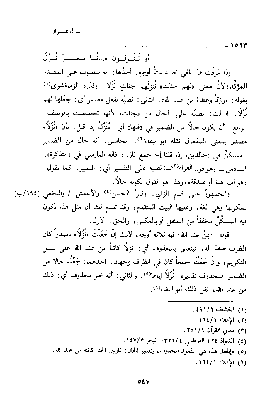 إذا عَرَفْتَ هذا ففي نصبه ستةُ أوجهٍ، أحدُها: أنه منصوب على المصدر المؤكِّد؛ لأنَّ معنى «لهم جنات» نُنْزلُهم جناتٍ نُزُلاً. وقَدَّره الزمخشري بقوله: «رزقاً وعطاءً من عند الله» . الثاني: نصبُه بفعل مضمر أي: جَعَلهم لهم نُزُلاً. الثالث: نصبُه على الحال من «جنات» لأنها تخصصت بالوصف.