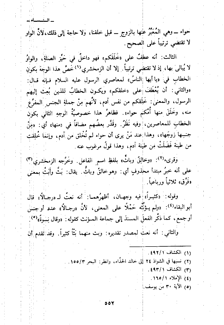 الثالث: أنه عطفٌ على «خَلَقَكم» فهو داخلٌ في حَيِّز الصلةِ، والواوُ لا يُبالى بها، إذ لا تقتضي ترتيباً. إلا أن الزمخشري خَصَّ هذه الوجهَ بكونِ الخطابِ في {ياأيها الناس} لمعاصري الرسول عليه السلام فإنه قال: «والثاني: أن يُعْطَفَ على» خلقكم «ويكون الخطابُ للذين بُعِث إليهم الرسول، والمعنى: خَلَقكم من نفس آدم، لأنَّهم مِنْ جملةِ الجنسِ المفرَّعِ منه، وخَلَقَ منها أُمَّكم حواء» . فظاهرُ هذا خصوصيَّةُ الوجهِ الثاني بكون الخطابِ للمعاصرين، وفيه نَظَرٌ. وقَدَّر بعضُهم مضافاً في «منها» أي: «مِنْ جنسِها زوجَها» ، وهذا عند مَنْ يرى أن حواء لم تُخْلق من آدم، وإنما خُلِقت من طينة فَضَلَتْ من طينة آدم، وهذا قولٌ مرغوب عنه.