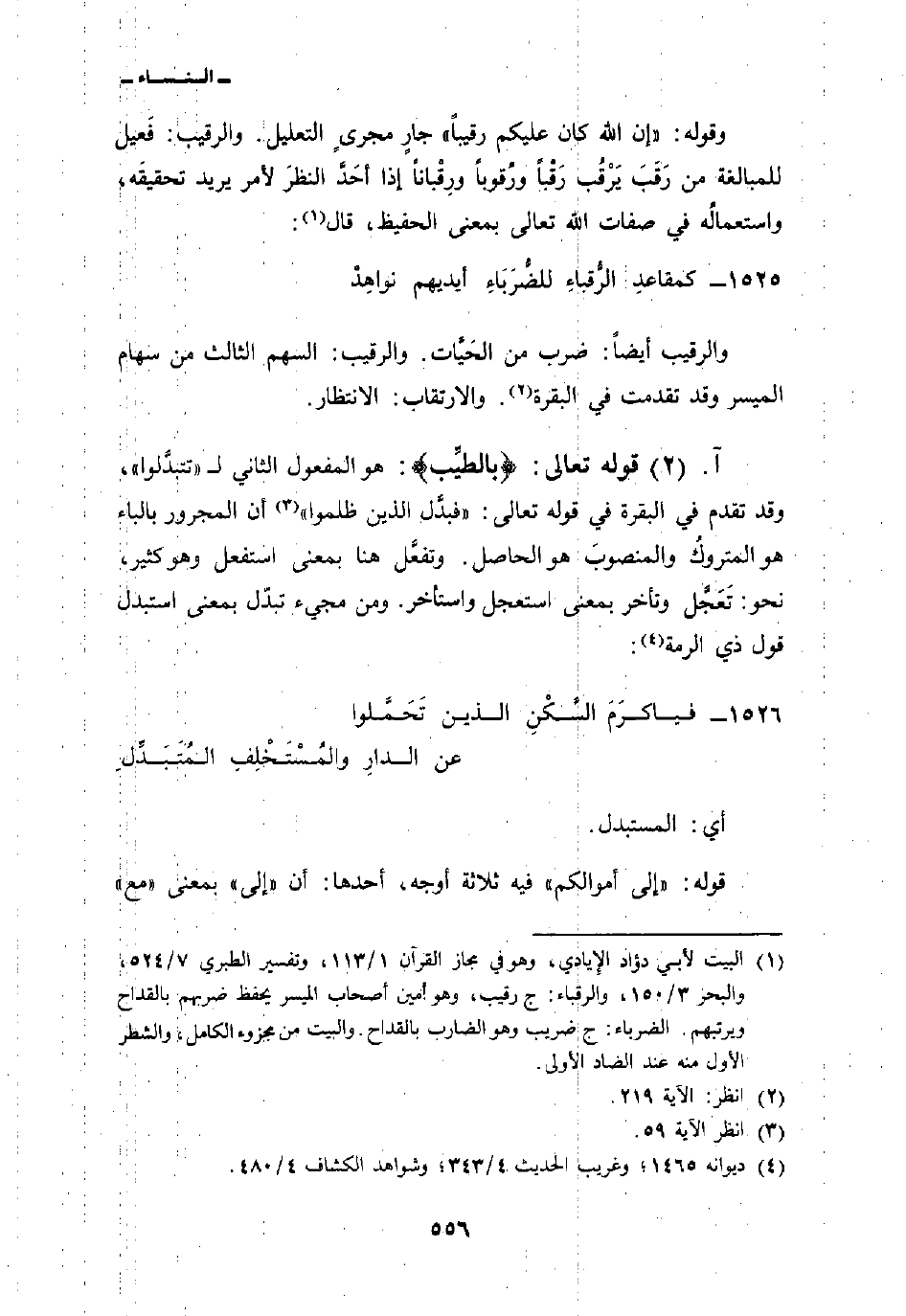 1525 - كمقاعِد الرُّقباءِ للضُّرَبَاءِ أيديهم نواهِدْ ... والرقيب أيضاً: ضرب من الحَيَّات. والرقيب: السهم الثالث من سهام الميسر وقد تقدمت في البقرة. والارتقاب: الانتظار.