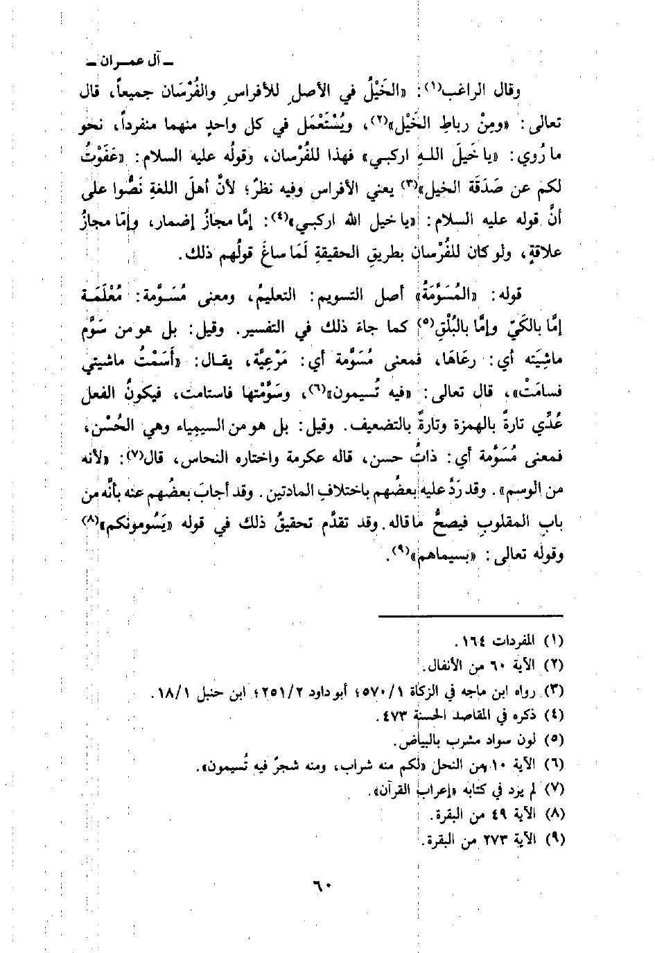 وقال الراغب: «الخَيْلُ في الأصلِ للأفراسِ والفُرْسَان جميعاً، قال تعالى: {وَمِن رِّبَاطِ الخيل} [الأنفال: 60] ، ويُستَعْمَل في كل واحدٍ منهما منفرداً، نحو ما رُوي:» يا خَيلَ اللهِ اركبي «فهذا للفُرْسان، وقوله عليه السلام:» عَفَوْتُ لكم عن صَدَقَة الخيل «يعني الأفراس وفيه نظرٌ؛ لأنَّ أهلَ اللغةِ نَصُّوا على أنَّ قوله عليه السلام:» يا خيل الله اركبي «: إمَّا مجازُ إضمار، وإمّا مجازُ علاقةٍ، ولو كان للفُرْسان بطريقِ الحقيقةِ لَمَا ساغَ قولُهم ذلك.