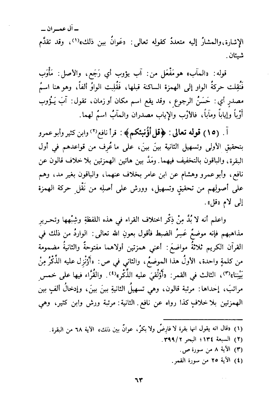 واعلم أنه لا بُدَّ مِنْ ذِكْر اختلاف القراء في هذه اللفظةِ وشِبْهها وتحريرِ مذاهبهم فإنه موضعٌ عَسِرُ الضبط فأقول بعونِ الله تعالى: الواردُ من ذلك القرآن الكريم ثلاثةُ مواضعَ: أعني همزتين أولاهما مفتوحةٌ والثانيةُ مضمومة من كلمةٍ واحدة، الأولُ هذا الموضعُ، والثاني في ص: {أَأُنزِلَ عَلَيْهِ الذكر مِن بَيْنِنَا} [ص: 8] ، الثالث في القمر: {أَأُلْقِيَ الذِّكْرُ عَلَيْهِ} [القمر: 25] . والقُرَّاء فيها على خمسِ مراتبَ، إحداها: مرتبة قالون، وهي تسهيلُ الثانيةِ بينَ بينَ، وإدخالُ ألفٍ بين الهمزتين بلا خلافٍ كذا رواه عن نافع. الثانية: مرتبة ورش وابن كثير، وهي