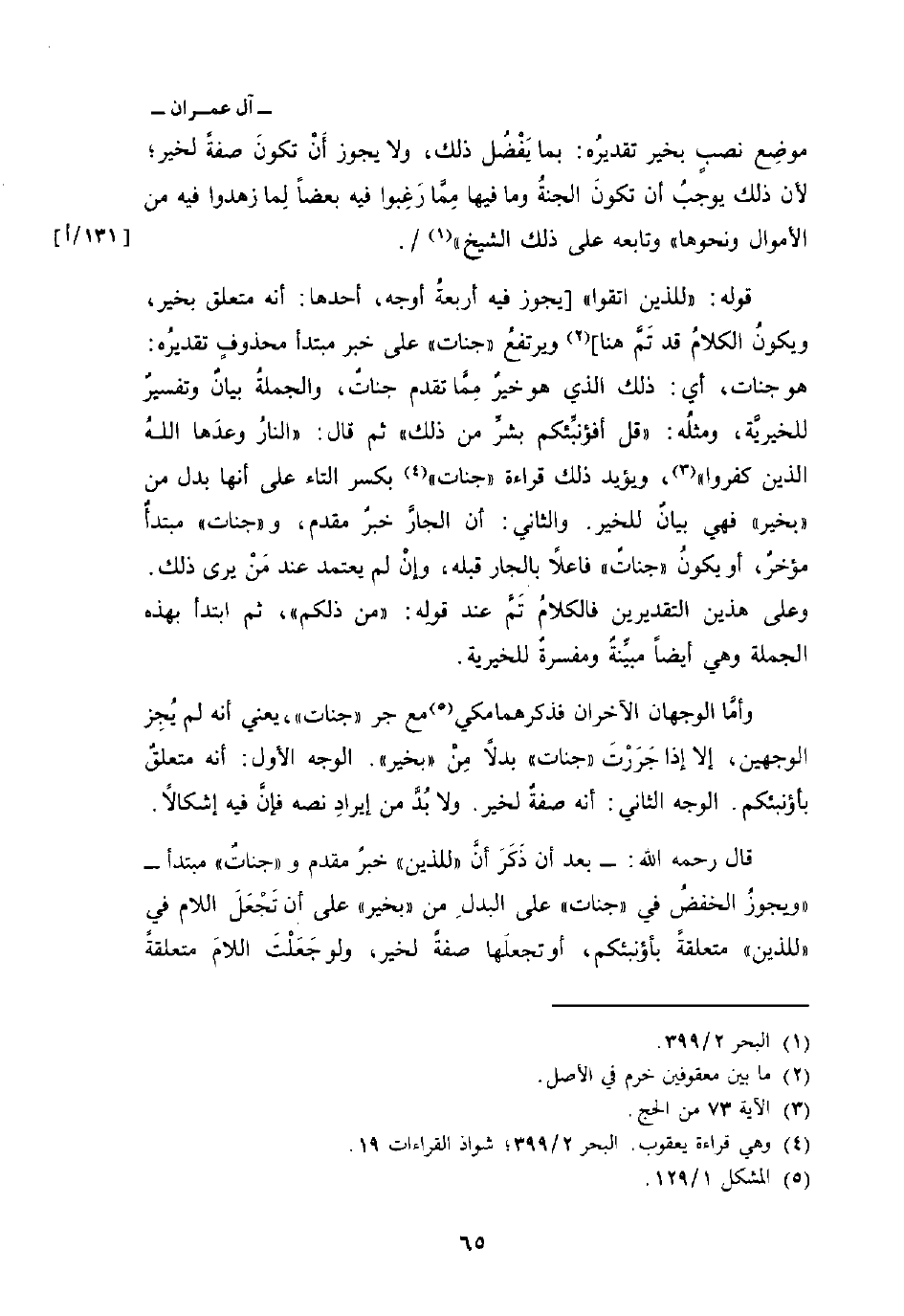 قال رحمه الله: بعد أن ذَكَرَ أنَّ «للذين» خبرٌ مقدم و «جناتٌ» مبتدأ «ويجوزُ الخفضُ في» جنات «على البدلِ من» بخير «على أن تَجْعَلَ اللام في» للذين «متعلقةً بأؤنبئكم، أو تجعلَها صفةً لخير، ولو جَعَلْتَ اللامَ متعلقةً