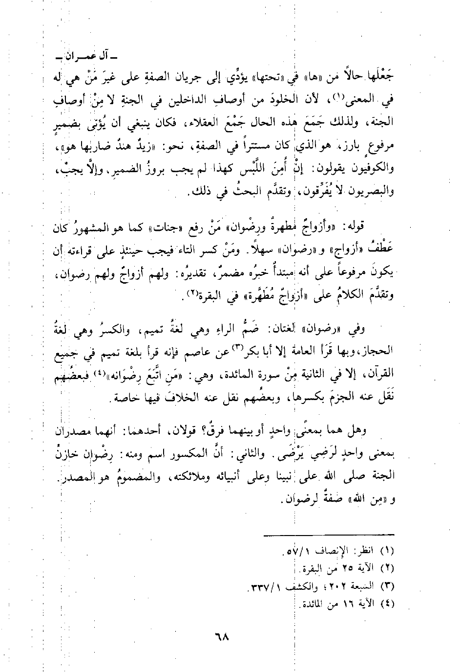 قوله: {وَأَزْوَاجٌ مُّطَهَّرَةٌ وَرِضْوَانٌ} مَنْ رفع «جنات» كما هو المشهورُ كان عَطْفُ «أزواج» و «رضوان» سهلاً. ومَنْ كسر التاء فيجب حينئذٍ على قراءته أن يكونَ مرفوعاً على أنه مبتدأٌ خبرُه مضمرٌ، تقديرُه: ولهم أزواجٌ ولهم رضوان، وتقدَّمَ الكلامُ على {أَزْوَاجٌ مُّطَهَّرَةٌ} في [البقرة: 25] .