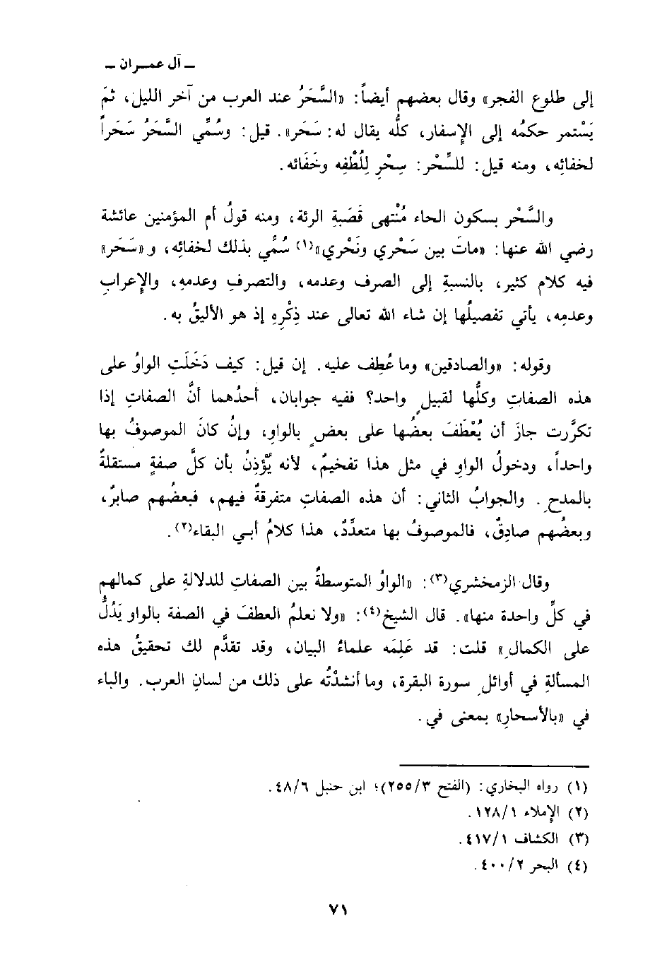 وقال الزمخشري: «الواوُ المتوسطةُ بين الصفاتِ للدلالةِ على كمالهم في كلِّ واحدة منها» . قال الشيخ: «ولا نعلمُ العطفَ في الصفة بالواو يَدُّلُّ على الكمالِ» قلت: قد عَلِمَه علماءُ البيان، وقد تقدَّم لك تحقيقُ هذه المسألةِ في أوائلِ سورة البقرة، وما أنشدْتُه على ذلك من لسانِ العرب. والباء في «بالأسحارِ» بمعنى في.