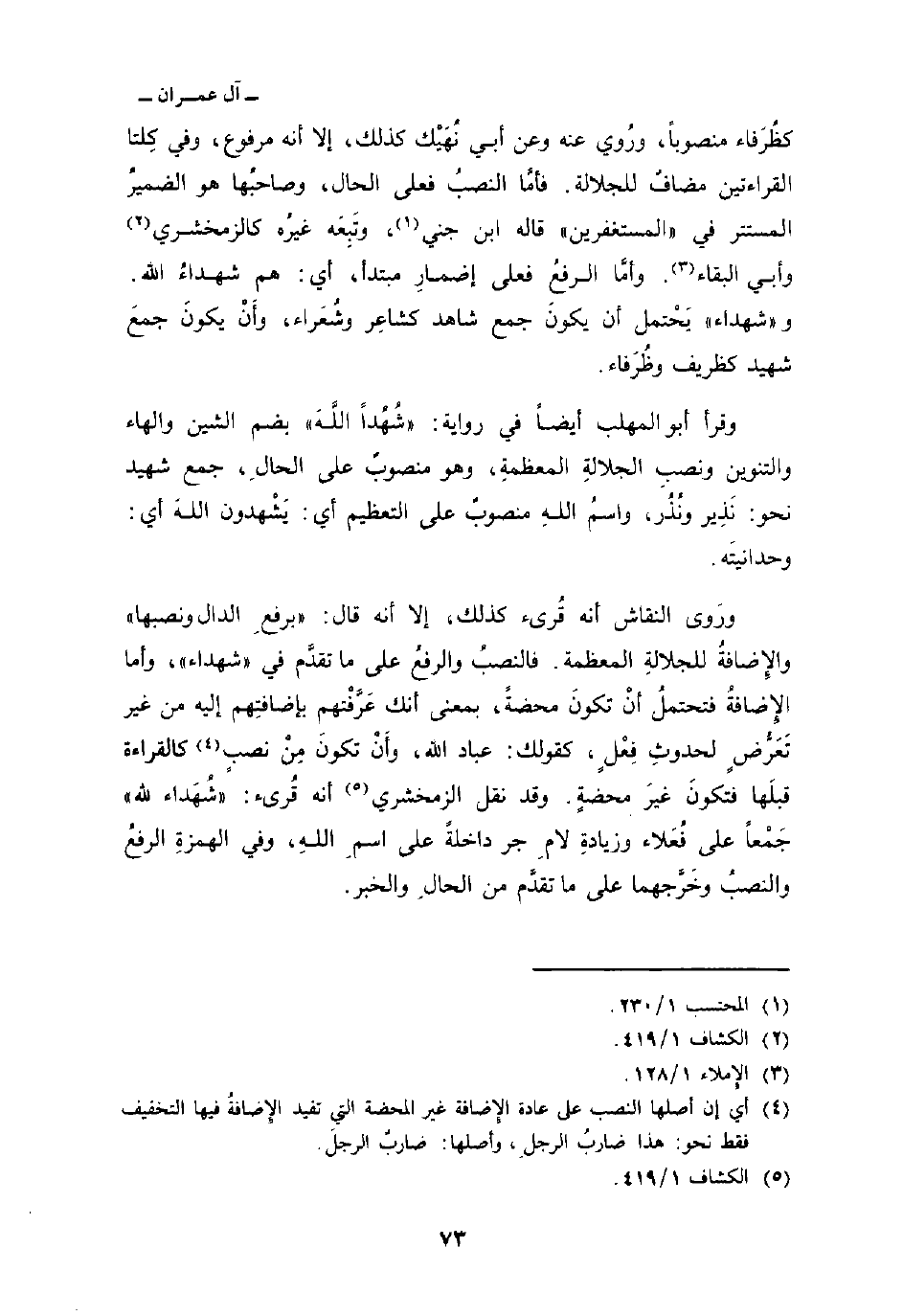 كظُرَفاء منصوباً، ورُوي عنه وعن أبي نُهَيْك كذلك، إلا أنه مرفوع، وفي كِلتا القراءتين مضافٌ للجلالة. فأمَّا النصبُ فعلى الحال، وصاحبُها هو الضميرُ المستتر في «المستغفرين» قاله ابن جني، وتَبِعَه غيرُه كالزمخشري وأبي البقاء. وأمَّا الرفعُ فعلى إضمارِ مبتدأ، أي: هم شهداءُ الله. و «شهداء» يَحْتمل أن يكونَ جمع شاهر كشاعِر وشُعَراء، وأَنْ يكونَ جمعَ شهيد كظريف وظُرَفاء.