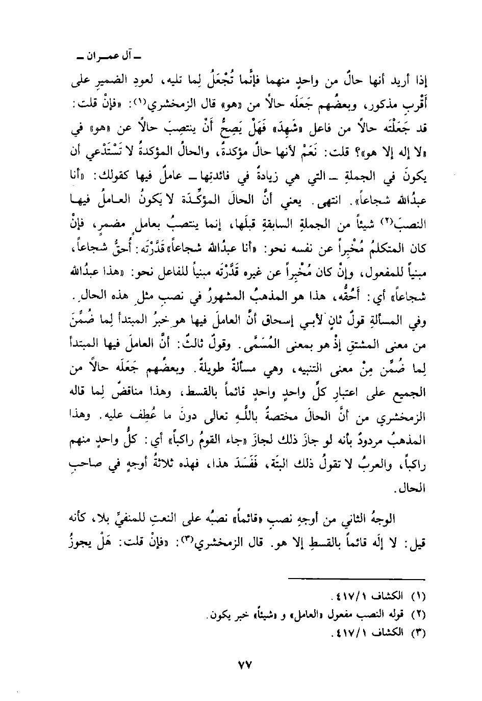 الوجهُ الثاني من أوجهِ نصبِ «قائماً» نصبُه على النعتِ للمنفيِّ بلا، كأنه قيل: لا إلَه قائماً بالقسطِ إلا هو. قال الزمخشري: «فإنْ قلت: هَلْي يجوزُ