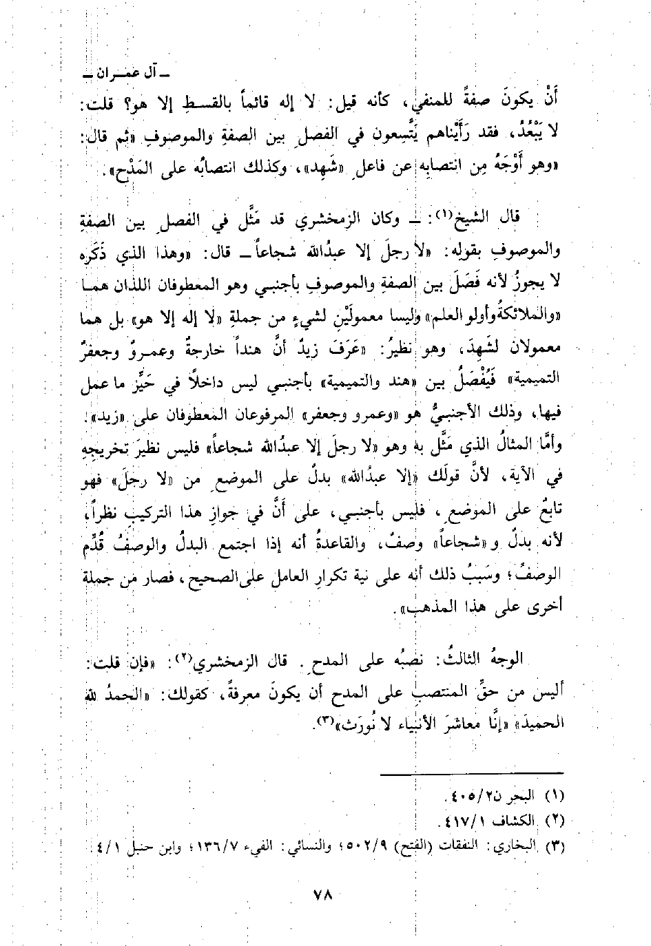 قال الشيخ: وكان الزمخشري قد مَثَّل في الفصلِ بين الصفةِ والموصوفِ بقولِه: «لا رجلَ إلا عبدُ الله شجاعاً قال:» وهذا الذي ذَكَره لا يجوزُ لأنه فَصَلَ بين الصفةِ والموصوفِ بأجنبي وهو المعطوفان اللذان هما «والملائكةُ وأولوا العلم» وليسا معمولَيْنِ لشيءٍ من جملةِ «لا إله إلا هو» بل هما معمولان لشَهِدَ، وهو نظيرُ: «عَرَفَ زيدٌ أنَّ هنداً خارجةٌ وعمروٌ وجعفرٌ التميمية» فَيُفْصَلُ بين «هند والتميمية» بأجنبي ليس داخلاً في حَيِّز ما عمل فيها، وذل الأجنبيُّ هو «وعمرو وجعفر» المرفوعان المعطوفان على «زيد» . وأمَّا المثالُ الذي مَثَّل به وهو «لا رجلَ إلا عبدُ الله شجاعاً» فليس نظيرَ تخريجِهِ في الآية، لأنَّ قولَك «إلا عبدُ الله» بدلُ على الموضعِ من «لا رجلَ» فهو تابعٌ على الموضعِ، فليس بأجنبي، على أَنَّ في جوازِ هذه التركيبِ نظراً، لأنه بدلٌ و «شجاعاً» وصفٌ، والقاعدةُ أنه إذا اجتمع البدلُ والوصفُ قُدِّم الوصفُ؛ وسَببُ ذلك أنه على نية تكرارِ العامل على الصحيح، فصار من جملة أخرى على هذا المذهب «.