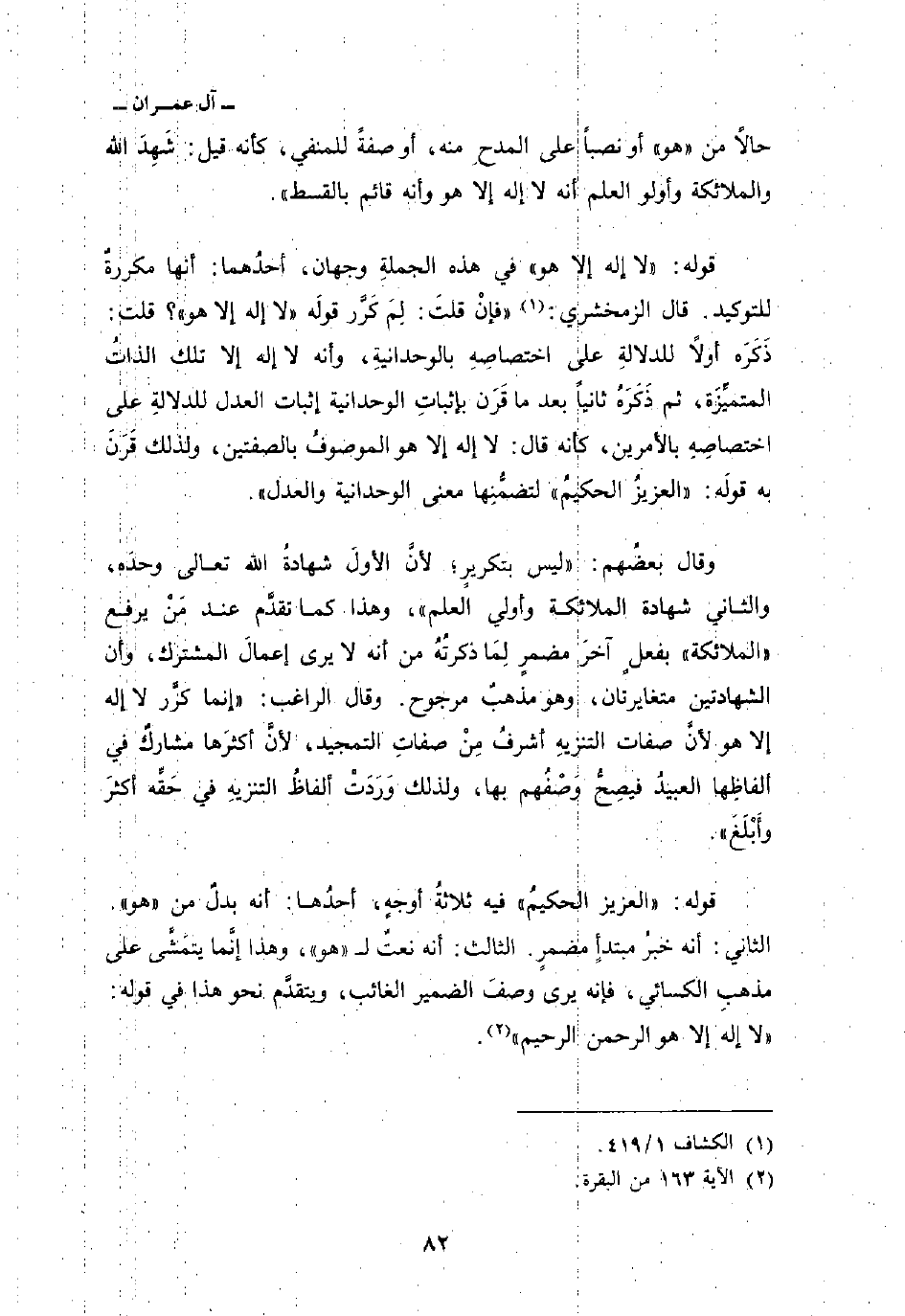 وقال بعضُهم: «ليس بتكريرٍ؛ لأنَّ الأولَ شهادةُ الله تعالى وحدَه، والثاني شهادة الملائكة وأولي العلم» ، وهذا كما تقدَّم عند مَنْ يرفع «الملائكة» بفعلٍ آخرَ مضمرٍ لِمَا ذكرتُهُ من أنه لا يرى إعمالَ المشترك، وأن الشهادتين متغايرتان، وهو مذهبٌ مرجوح. وقال الراغب: «إنما كرَّر لا إله إلا هو لأنَّ صفات التنزيهِ أشرفُ مِنْ صفاتِ التمجيد، لأنَّ أكثرَها مشاركٌ في ألفاظِها العبيدُ فيصِحُّ وَصْفُهم بها، ولذلك وَرَدَتْ ألفاظُ التنزيهِ في حَقِّه أكثرَ وأَبْلَغَ» .