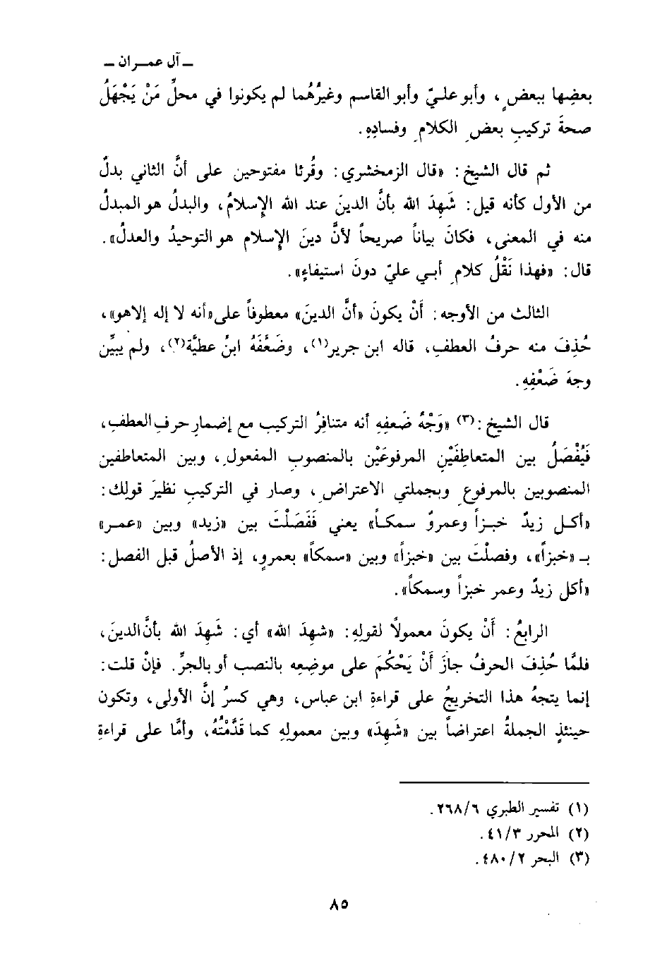 ثم قال الشيخ: «قال الزمخشري: وقُرئا مفتوحين على أنَّ الثاني بدلٌ من الأول كأنه قيل: شَهِدَ الله بأنَّ الدينَ عند الله الإِسلامُ، والبدلُ هو المبدلُ منه في المعنى، فكانَ بياناً صريحاً لأنَّ دينَ الإِسلام هو التوحيدُ والعدلُ» . قال: «فهذا نَقْلُ كلامِ أبي عليّ دونَ استيفاءٍ» .