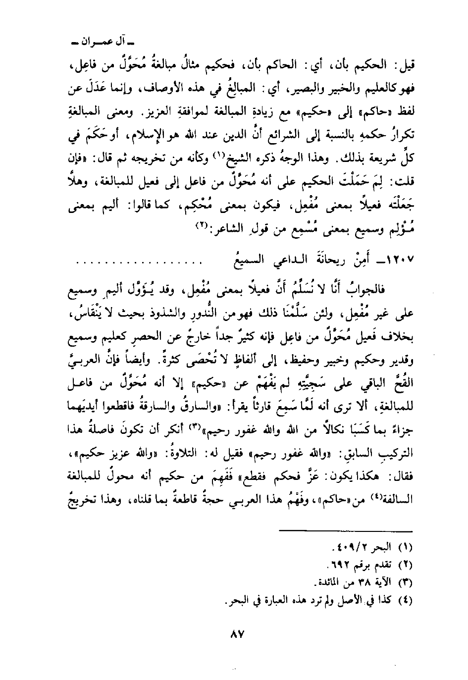فالجوابُ أَنَّا لا نُسَلِّمُ أَنَّ فعيلاً بمعنى مُفْعِل، وقد يُؤَوَّل أليمِ وسميع علىغير مُفْعِل، ولئن سَلَّمْنَا ذلك فهو من النُّدورِ والشذوذ بحيث لا يَنْقَاسُ، بخلاف فَعيل مُحَوَّلٌ من فاعِل فإنه كثيرٌ جداً خارجٌ عن الحصرِ كعليم فإنَّ العربيَّ القُحَّ الباقي على سَجِيَّتِهِ لم يَفْهَمْ عن» حكيم «إلا أنه مُحَوَّلٌ من فاعل للمبالغةِ، ألا ترى أنه لَمَّا سَمِعَ قارئاً يقرأ:» والسارقُ والسارقةُ فاقطعوا أيدَيهما جزاءً بما كَسَبَا نكالاً من الله والله غفور رحيم «أنكر أن تكونَ فاصلةُ هذا التركيبِ السابقِ:» والله غفور رحيم «فقيل له: التلاوةُ:» والله عزيز حكيم «، فقال: هكذا يكون: عَزَّ فحكم فقطع» فَفَهِمَ من حكيم أنه محولٌ للمبالغة السالفة من «حاكم» ، وفَهْمُ هذا العربي حجةٌ قاطعةٌ بما قلناه، وهذا تخريجٌ