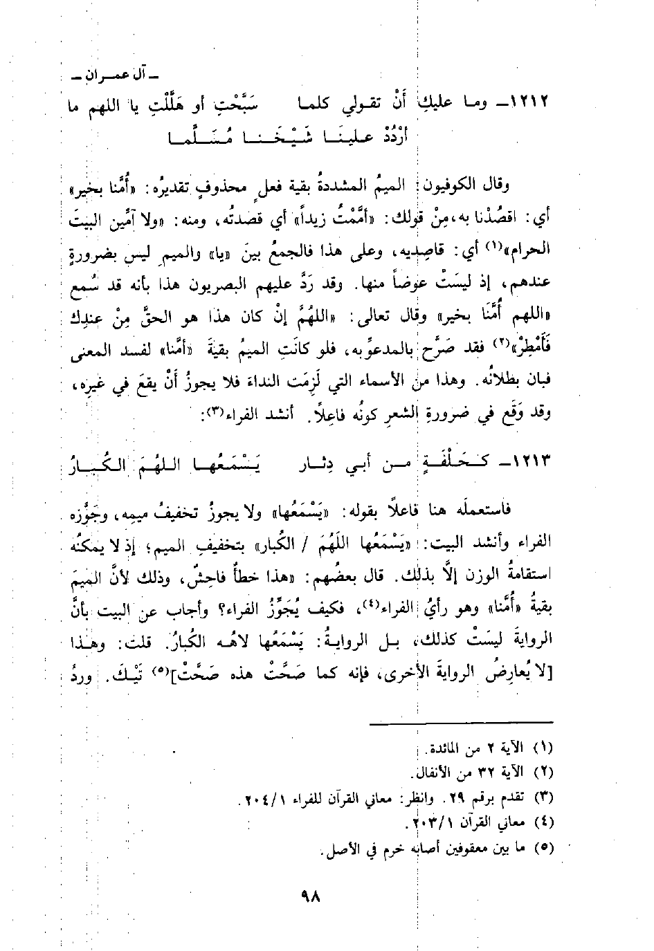 فاستعملَه هنا فاعلاً بقوله: «يَسْمَعُها» ولا يجوزُ تخفيفُ ميمِه، وجَوَّزه الفراء وأنشد البيت: «يَسْمَعُها اللَهُمَ/ الكُبار» بتخفيفِ الميم؛ إذ لا يمكنُه استقامةُ الوزن إلاَّ بذلك. قال بعضُهم: «هذا خطأٌ فاحِشٌ، وذلك لأنَّ الميمَ بقيةُ» أُمَّنا «وهو رأيُ الفراء، فكيف يُجَوِّزُ الفراء؟ وأجاب عن البيت بأنَّ الروايةَ ليسَتْ كذلك، بل الروايةُ: يَسْمَعُها لاهُه الكُبارُ. قلت: وهذا [لا يُعارِضُ الروايةً الأخرى، فإنه كما صَحَّتْ هذه صَحَّتْ] تَيْكَ. وردَّ