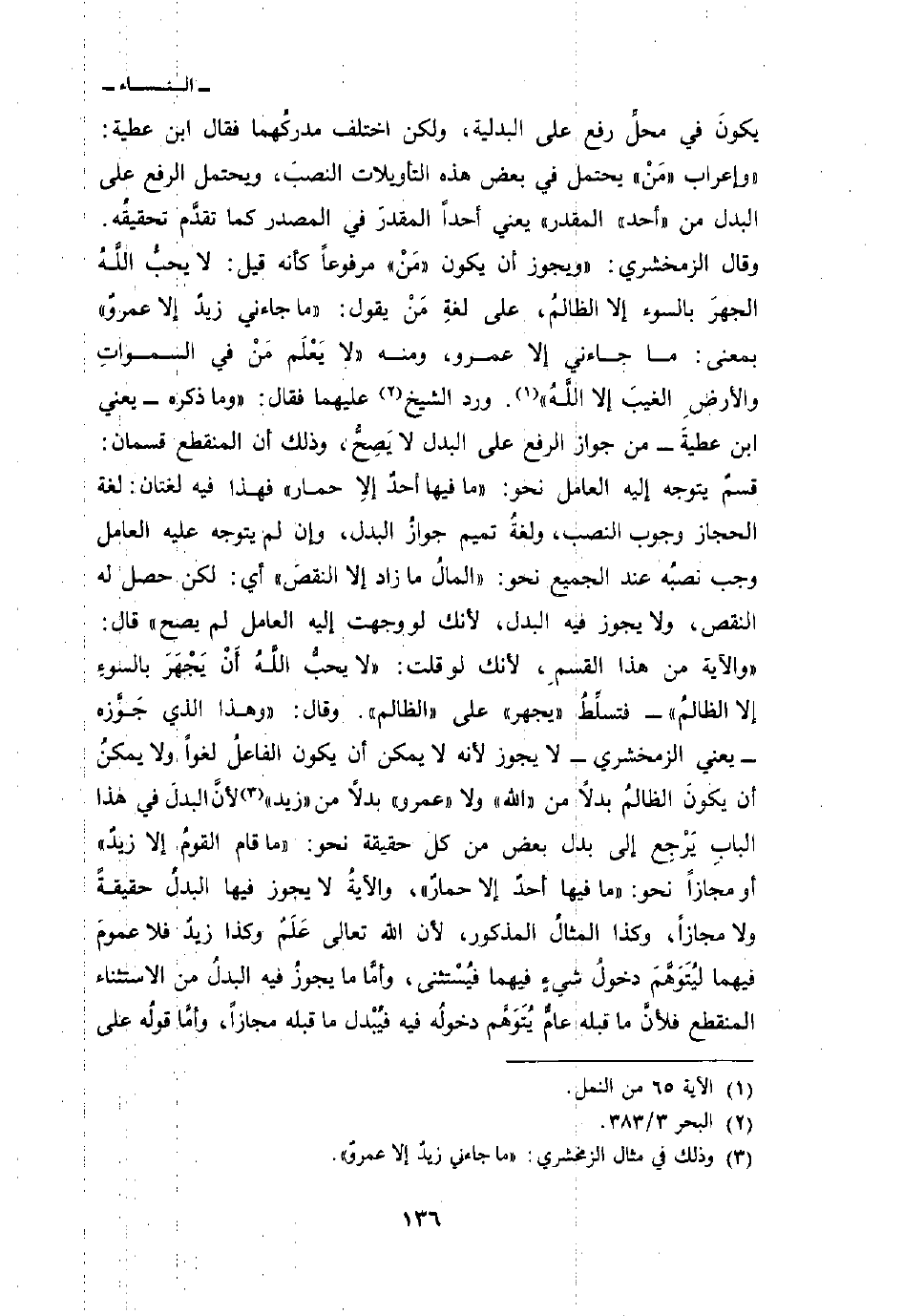يكونَ في محلِّ رفع على البدلية، ولكن اختلف مدركُهما فقال ابن عطية: «وإعراب» مَنْ «يحتمل في بعض هذه التأويلات النصبَ، ويحتمل الرفع على البدل من» أحد «المقدر» يعني احداً المقدرَ في المصدر كما تقدَّم تحقيقُه. وقال الزمخشري: و «يجوز أن يكون» مَنْ «مرفوعاً كأنه قيل: لا يحبُّ اللَّهُ الجهرَ بالسوء إلا الظالمُ، على لغةِ مَنْ يقول:» ما جاءني زيدٌ إلا عمروٌ «بمعنى: ما جاءني إلا عمرو، ومنه {لاَّ يَعْلَمُ مَن فِي السماوات والأرض الغيب إِلاَّ الله} [النمل: 65] . ورد الشيخ عليهما فقال:» وما ذكره - يعني ابن عطية - من جواز الرفع على البدل لا يَصِحُّ، وذلك أن المنقطع قسمان: قسمٌ يتوجه إليه العامل نحو: «ما فيها أحدٌ إلاِ حمار» فهذا فيه لغتان: لغة الحجاز وجوب النصب، ولغةُ تميم جوازُ البدل، وإن لم يتوجه عليه العامل وجب نصبُه عند الجميع نحو: «المالُ ما زاد إلا النقصَ» أي: لكن حصل له النقص، ولا يجوز فيه البدل، لأنك لو وجهت إليه العامل لم يصح «قال:» والآية من هذا القسمِ، لأنك لو قلت: «لا يحبُّ اللَّهُ أَنْ يَجْهَرَ بالسوءِ إلا الظالمُ» فتسلِّطُ «يجهر» على «الظالم» لم يصح وقال: «وهذا الذي جَوَّزه - يعني الزمخشري- لا يجوز لأنه لا يمكن أن يكون الفاعلُ لغواً ولا يمكن أن يكونَ الظالمُ بدلاً من» الله «ولا» عمرو «بدلاً من» زيد «لأنَّ البدلَ في هذا الباِبِ يَرْجِع إلى بدل بعض من كل حقيقة نحو:» ما قام القومُ إلا زيدٌ «أو مجازاً نحو:» ما فيها أحدٌ إلا حمارٌ، والآيةٌ لا يجوز فهيا البدلُ حقيقةً ولا مجازاً، وكذا المثالُ المذكور، لأن الله تعالى عَلَمٌ وكذا زيدٌ فلا عمومَ فيهما ليُتَوَهَّمَ دخولُ شيءٍ فيهما فيُسْتثنى، وأمَّا ما يجوزُ فيه البدلُ من الاسثناء المنقطع فلأنَّ ما قبله عامٌّ يُتَوَهَّم دخولُه فيه فيُبْدل ما قبله مجازاً، وأمَّا قولُه على