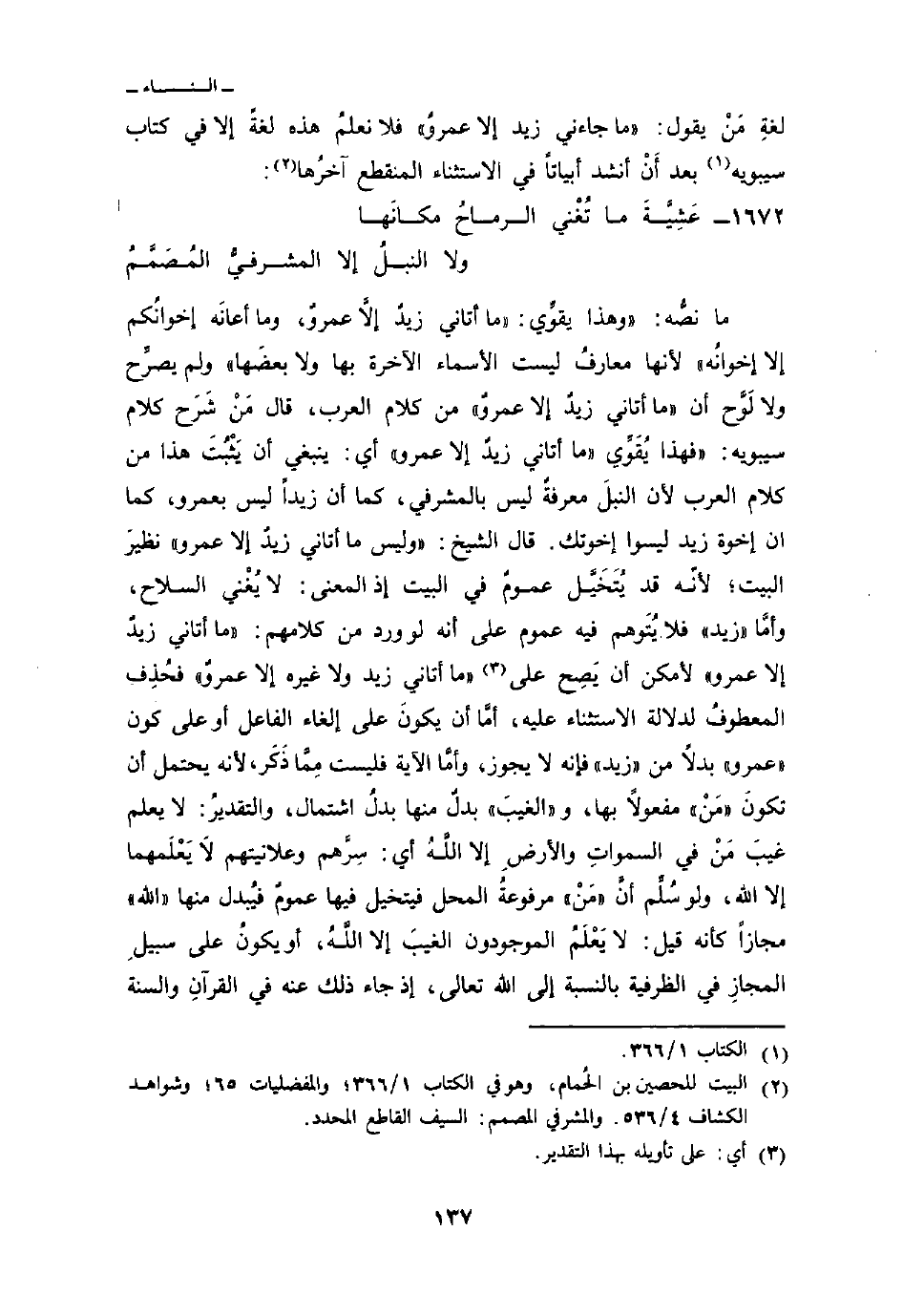 ما نصُّه: «وهذا يقوِّي:» ما أتاني زيدٌ إلاَّ عمروٌ، وما أعانَه إخوانُكم إلا إخوانُه «لأنها معارفُ ليست الأسماء الآخرة بها ولا بعضَها» ولم يصرِّح ولا لَوَّح أن «ما أتاني زيدٌ إلا عمرو» من كلام العرب، قال مَنْ شَرَح كلام سيبويه: «فهذا يُقَوِّي» ما أتاني زيدٌ إلا عمرو «أي: ينبغي أن يَثْبُتَ هذا من كلام العرب لأن النبلَ معرفةٌ ليس بالمشرفي، كما أن زيداً ليس بعمرو، كما ان إخوة زيد ليسوا إخوتك. قال الشيخ:» وليس ما أتاني زيدٌ إلا عمرو «نظيرَ البيت؛ لأنّه قد يُتَخَيَّل عمومٌ في البيت إذ المعنى: لا يُغْني السلاح، وأمَّا» زيد «فلا يُتَوهم فيه عموم على أنه لو ورد من كلامهم:» ما أتاني زيدٌ إلا عمرو «لأمكن أن يَصِح على» ما أتاني زيد ولا غيره إلا عمروٌ «فحُذِف المعطوفُ لدلالة الاستثناء عليه، أمَّا أن يكونَ على إلغاء الفاعل أو على كون» عمرو «بدلاً من» زيد «فإنه لا يجوز، وأمَّا الآية فليست مِمَّا ذَكَر، لأنه يحتمل أن تكونَ» مَنْ «مفعولاً بها، و» الغَيبَ «بدلٌ منها بدلُ اشتمال، والتقديرُ: لايعلم غيبَ مَنْ في السماواتِ والأرضِ إلا اللَّهُ أي: سِرَّهم وعلانيتهم لاَ يَعْلَمها إلا الله، ولو سُلِّم أنَّ» مَنْ «مرفوعةٌ المحل فيتخيل فيها عمومٌ فيُبدل منها» الله «مجازاً كأنه قيل: لا يَعْلَمُ الموجودون الغيبَ إلا اللَّهُ، أو يكونُ على سبيلِ المجازِ في الظرفية بالنسبة إلى الله تعالى، إذ جاء ذلك عنه في القرآنِ والسنة