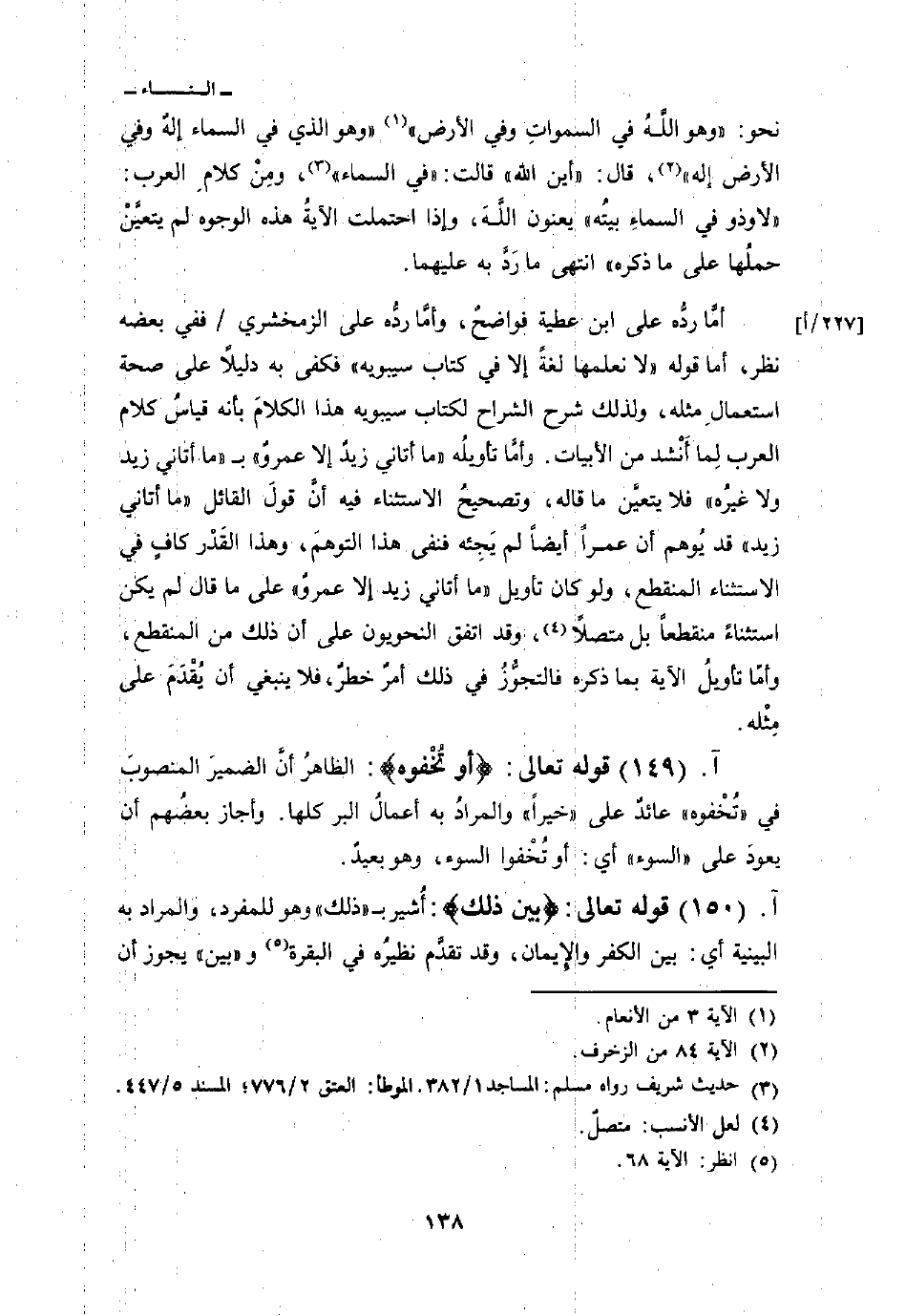 أمَّا ردُّه على ابن عطية فواضحٌ، وأمَّا ردُّه على الزمخشري / ففي بعضه نظر، أما قوله «لا نعلمها لغةً إلى في كتاب سيبويه» فكفى به دليلا على صحة استعمالِ مثله، ولذلك شرح الشراح لكتاب سيبويه هذا الكلامَ بأنه قياسُ كلام العرب لِما أَنْشد من الأبيات. وأمَّا تأويلُه «ما أتاني زيدٌ إلا عمروٌ» ب «ما أتاني زيد ولا غيرُه» فلا يتعيَّن ما قاله، وتصحيحُ الاستثناء فيه أنَّ قولَ القائل «ما أتاني زيد» قد يُوهم أن عمراً أيضاً لم يَجِئه فنفى هذا الوهمَ، وهذا القَدْر كافٍ في الاستثناء المنقطع، ولو كان تأويل «ما أتاني زيد إلا عمروٌ» على ما قال لم يكن استثناءً منقطعاً بل متصلاً، وقد اتفق النحويون على ان ذلك من المنقطع، وأمّا تأويلُ الآية بما ذكره فالتجوُّزُ في ذلك أمرٌ خطرٌ، فلا ينبغي أن يُقْدَمَ على مِثْله.