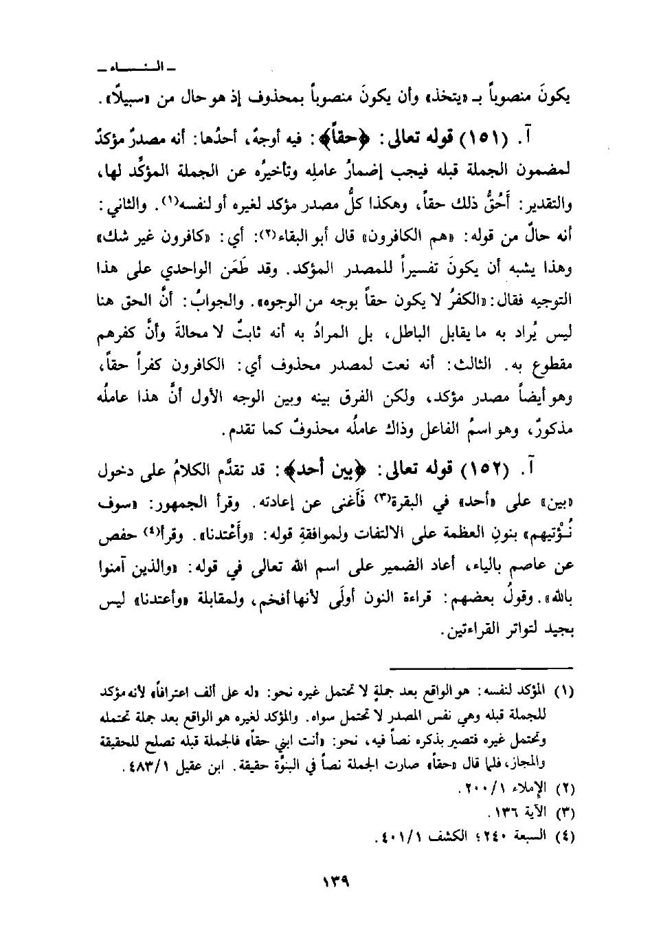 قوله تعالى: {حَقّاً} : فيه أوجهٌ، أحدُهما: أنه مصدرٌ مؤكدٌ لمضمون الجملة قبله فيجب إضمارُ عامِله وتأخيره عن الجملة المؤكِّد لها، والتقدير: أَحُقُّ ذلك حقاً، وهكذا كلُّ مصدر مؤكد لغيره أو لنفسه والثاني: أنه حالٌ من قوله: {هُمُ الكافرون} قال أبو البقاء: أي: «كافرون غير شك» وهذا يشبه أن يكونَ تفسيراً للمصدر المؤكد. وقد طَعَن الواحدي على هذا التوجيه فقال: «الكفرُ لا يكون حقا» بوجه من الوجوه «. والجوابُ: أنَّ الحق هنا ليس يُراد به ما يقابل الباطل، بل المرادُ به أنه ثابتٌ لا محالةَ وأنَّ كفرهم مقطوع به. الثالث: أنه نعت لمصدر محذوف أي: الكافرون كفراً حقاً، وهو أيضاً مصدر مؤكد، ولكن الفرق بينه وبين الوجه الأول أنَّ هذا عاملُه مذكورٌ، وهو اسمُ الفاعل وذاك عاملُه محذوفٌ كما تقدم.