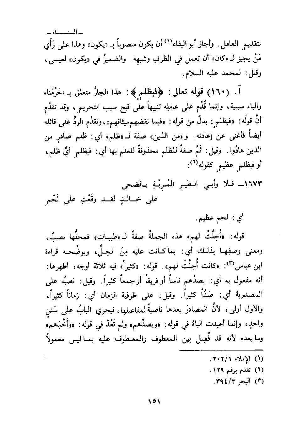 قوله: {أُحِلَّتْ لَهُمْ} هذه الجملةُ صفةٌ ل «طيبات» فمحلُّها نصبٌ، ومعنى وصفِها بذلك أي: بما كانت عليه مِنَ الحِلِّ، ويوضَّحه قراءة ابن عباس: {كانت أُحِلَّتْ لهم} قوله: «كثيراً» فيه ثلاثة أوجه، أظهرها: أنه مفعول به أي: بصدِّهم ناساً أو فريقاً أو جمعاً كثيراً. وقيل: نصبُه على المصدرية أي: صَدَّاً كثيراً. وقيل: على ظرفيه الزمان أي: زماناً كثيراً، والأول أولى، لأنَّ المصادرَ بعدها ناصبةٌ لمفاعيلها، فيجري البابُ على سَننٍ واحدٍ، وإنما أعيدت الباءُ في قوله: {وَبِصَدِّهِمْ} ولم تَعُدْ في قوله: «وأَخْذِهم» وما بعده لأنه قد فُصِل بين المعطوف والمعطوف عليه بما ليس معمولاً