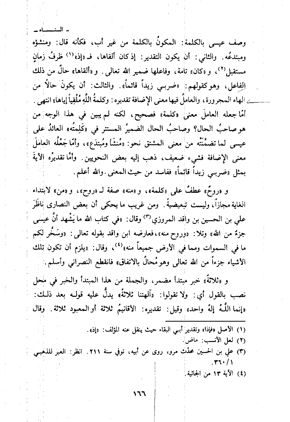 و «روحٌ» عطفٌ على «كلمة» و «منه» صفة ل «روح» ، و «من» لابتداء الغاية مجازاً، وليست تبعيضيةً. ومن غريب ما يحكى أن بعض النصارى ناظَرَ علي بن الحسين بن واقد المروزي وقال: «في كتاب الله ما يَشْهد أنَّ عيسى جزءٌ من الله» وتلا: «وروح منه» ، فعارضه ابن واقد بقوله تعالى: {وَسَخَّرَ لَكُمْ مَّا فِي السموات وَمَا فِي الأرض جَمِيعاً مِّنْهُ} [الجاثية: 13] ، وقال: «يلزم أن تكون تلك الأشياء جزءاً من الله تعالى وهو مُحالٌ بالاتفاق» فانقطع النصراني وأسلم.