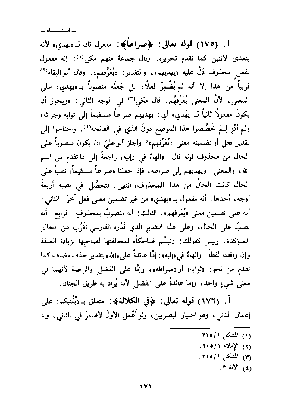 قوله تعالى: {صِرَاطاً} : مفعول ثان ل «يهدي» لأنه يتعدى لاثنين كما تقدم تحريره. وقال جماعة منهم مكي: إنه مفعول بفعلٍ محذوف دَلَّ عليه «يهديهم» ، والتقدير: «يُعَرِّفهم» وقال أبو البقاء قريباً من هذا إلا أنه لم يُضْمِرْ فعلاً، بل جَعَلَه منصوباً ب «يهدي» على المعنى، لأنَّ المعنى يُعَرِّفهُم. قال مكي في الوجه الثاني: «ويجوز أن يكونَ مفعولاً ثانياً ل» يَهْدي «أي: يهديهم صراطاً مستقيماً إلى ثوابه وجزائه» ولم اَدْرِ لِمَ خَصَّصوا هذا الموضع دونَ الذي في الفاتحة، واحتاجوا إلى تقدير فعل أو تضمنيه معنى «يُعَرِّفهم» ؟ وأجاز أبو عليّ أن يكون منصوباً على الحال من محذوف فإنه قال: «الهاءُ في» إليه «راجعةٌ إلى ما تقدم من اسم الله، والمعنى: ويهديهم إلى صراطه، فإذا جعلنا» صراطاً مستقيماً «نصباً على الحال كانت الحالُ من هذا المحذوفِ» انتهى. فتحصَّل في نصبه أربعةُ أوجه، أحدها: أنه مفعول ب «يهدي» من غير تضمين معنى فعل آخرَ. الثاني: أنه على تضمين معنى «يُعَرفهم» الثالث: أنه منصوبٌ بمحذوفٍ. الرابع: أنه نصبٌ على الحال، وعلى هذا التقديرِ الذي قَدَّره الفارسي تقْرُب من الحالِ المؤكدة، وليس كقولك: «تبسَّم ضاحكاً» لمخالفتِها لصاحبِها بزيادةِ الصفةِ وإن وافقته لفظاً. والهاءُ في «إليه» إمَّا عائدةٌ على «الله» بتقدير حذف مضاف كما تقدم من نحو: «ثوابه» أو «صراطه» ، وإمَّا على الفضلِ والرحمة لأنهما في معنى شيءٍ واحد، وإما عائدةٌ على الفضلِ لأنه يُراد به طريق الجنان.