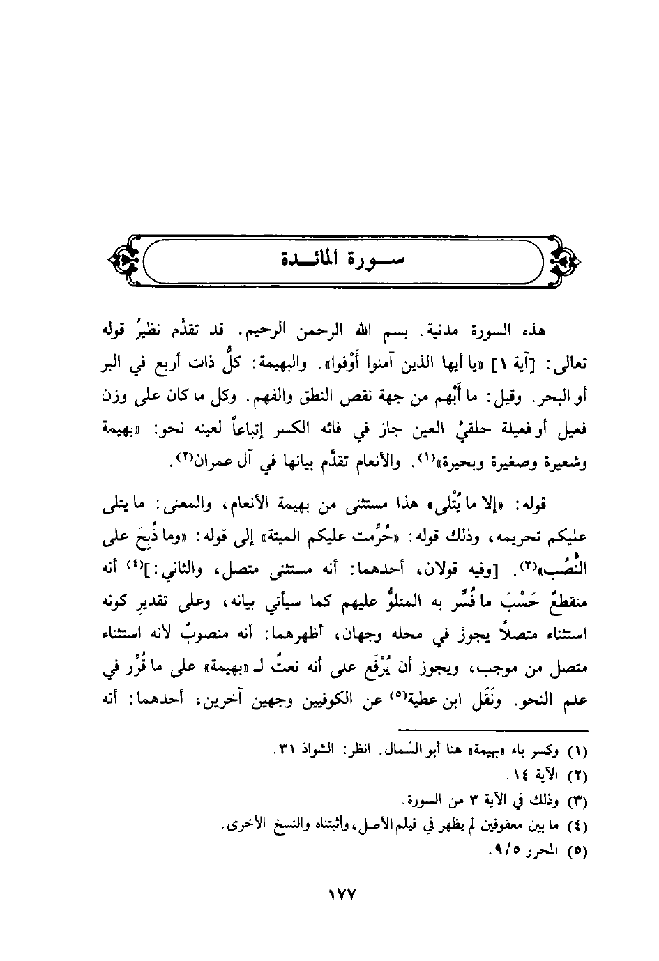 هذه السورة مدنية. بسم الله الرحمن الرحيم. قد تقدَّم نظيرُ قوله تعالى: [آية 1] {يَا أَيُّهَا الذين آمَنُواْ أَوْفُواْ} والبهيمة: كلُّ ذات أربع في البر أو البحر. وقل: ما أَبْهم من جهة نقص النطق والفهم. وكل ما كان على وزن فعيل أو فعلية حلقيَّ العين جاز في فائه الكسر إتباعاً لعينه نحو: بيهمة وشعيرة وصغيرة وبحيرة «والأنعام تقدَّم بيانها في آل عمران.