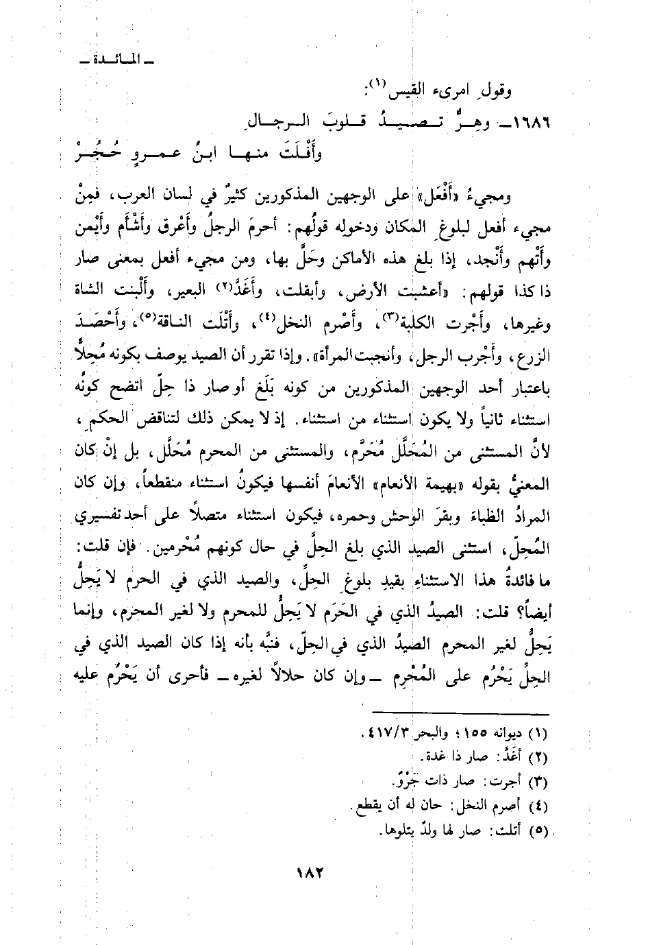 ومجيءُ «أَفْعَل» على الوجهين المذكورين كثيرٌ في لسان العرب، فمِنْ مجيء افعل لبلوغِ المكان ودخولِه قولُهم: أحرمَ الرجلُ وأَعْرق وأَشْأَم وأَيْمن وأَتْهم وأَنْجد، إذا بلغ هذه الأمكان وحَلَّ بها، ومن مجيء أفعل بمعنى صار ذا كذا قولهم: «أعشبت الأرض، وأبقلت، وأَغَدَّ البعير، وأَلْبنت الشاة وغيرها، وأَجْرت الكلبة، وأَصْرم النخل، وأَتْلَت الناقة، وأَحْصَدَ الزرع، وأَجْرب الرجل، وأنجبت المرأة» وإذا تقرر أن الصيد يوصف بكون مُحِلاًّ باعتبار أحد الوجهين المذكورين من كونه بَلَغ أو صار ذا حِلّ اتضح كونُه استثناء ثانياً ولا يكون استثناء من استثناء.