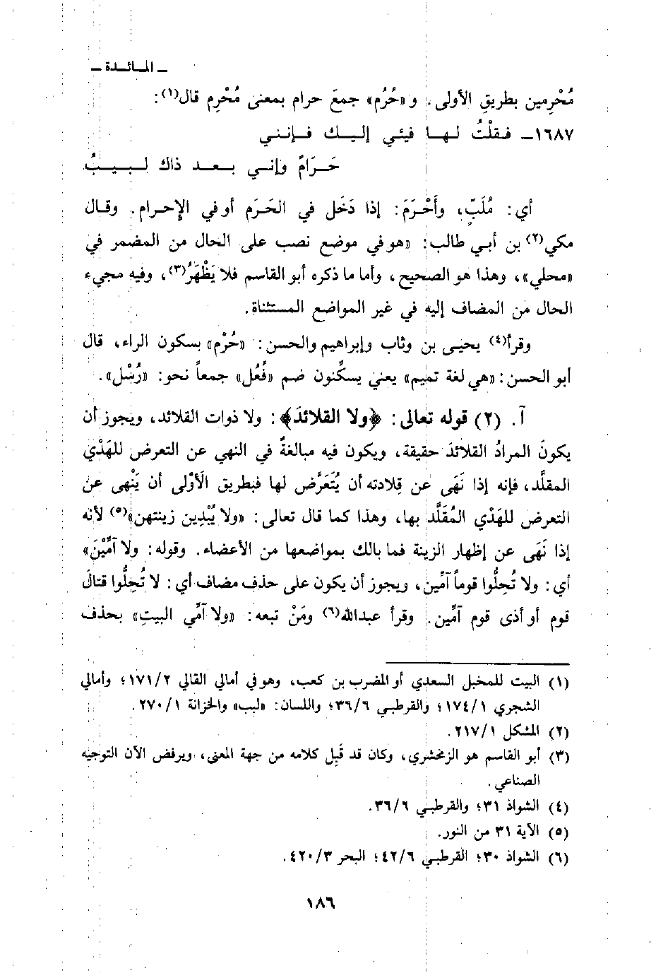 قوله تعالى: {وَلاَ القلائد} : ولا ذوات القلائد، ويجوز أن يكونَ المرادُ القلائدَ حقيقة، ويكون فيه مبالغةٌ في النهي عن التعرض للهَدي المقلَّد، فإنه إذا نَهَى عن قِلادته أن يُتَعَرَّض لها فبطريق الأَوْلى أن يَنْهى عن التعرض للهَدْي المُقَلَّد بها، وهذا كما قال تعالى: {وَلاَ يُبْدِينَ زِينَتَهُنَّ} لأنه إذا نَهَى عن إظهار الزينة فما بالك بمواضعها من الأعضاء. وقوله: ولا آمِّيْنَ «أي: ولا تُحِلُّوا قوماً آمِّين، ويجوز ان يكون على حذف مضاف أي: لا تُحِلُّوا قتالَ قوم أو أذى قوم آمِّين. وقرأ عبد الله ومَنْ تبعه:» ولا آمِّي البيتِ «بحذف