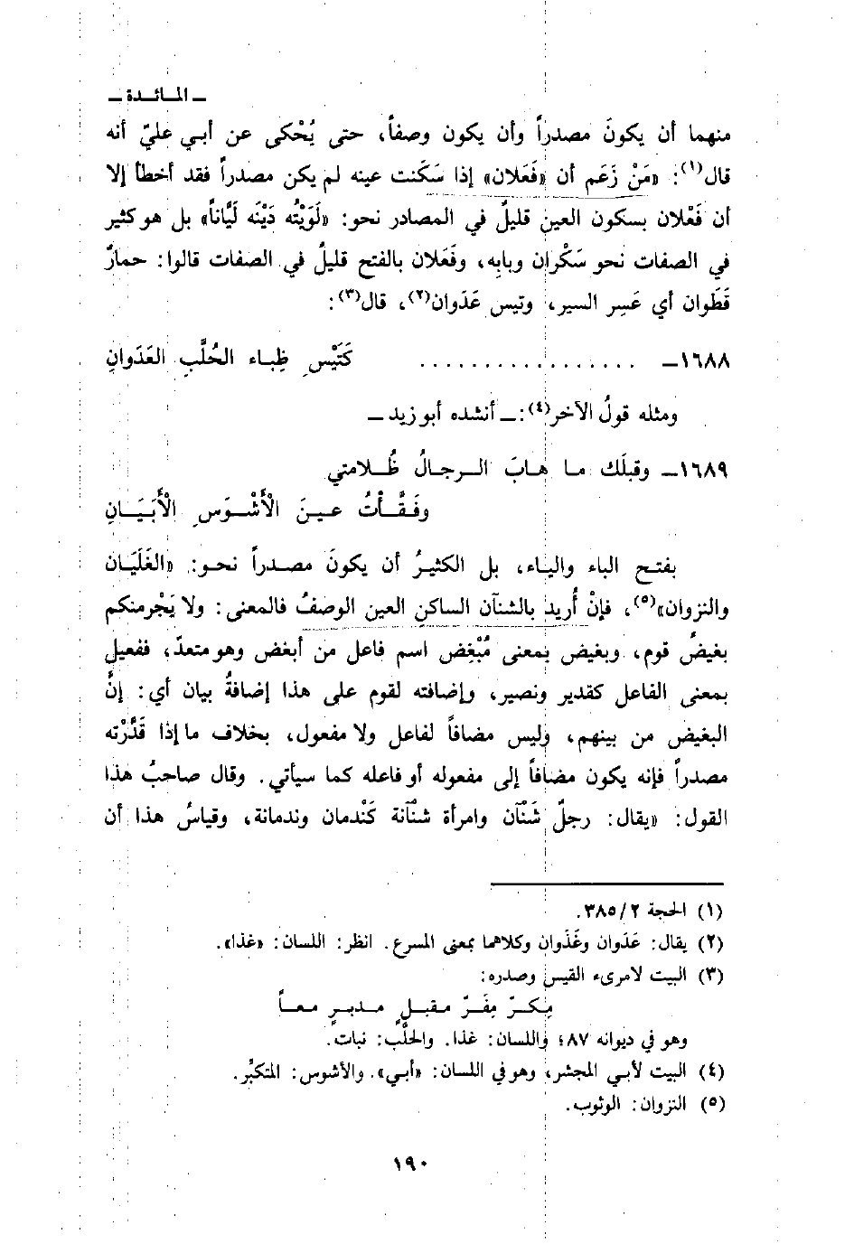 منهما أن يكونَ مصدراً وأن يكون وصفاً، حتى يُحْكى عن أبي عليّ أنه قال:» مَنْ زَعَم أن «فَعَلان» إذا سَكَنت عينه لم يكن مصدراً فقد أخطأ إلا ان فَعْلان بسكون العين قليلٌ في المصادر نحو: «لَوَيْتُه دينه لَيَّاناً» بل هو كثير في الصفات نحو سَكْران وبِابِه، وفَعَلان بالفتح قليلٌ في الصفات قالوا: حمارٌ قَطَوان أي عَسِر السير، وتيس عَدَوان قال:
